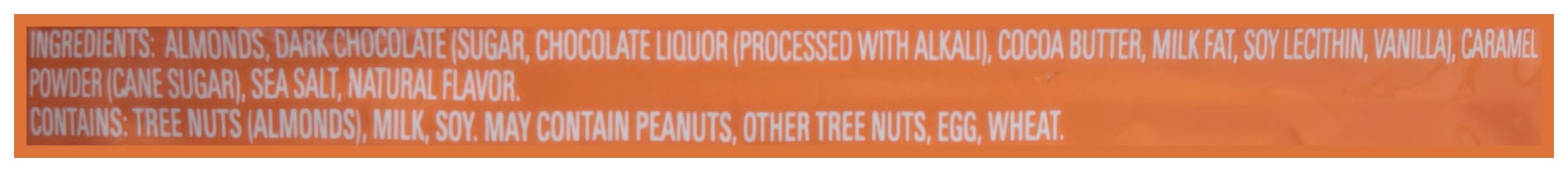 Ingredients: Almonds, Dark Chocolate (Sugar, Chocolate Liquor (Processed with Alkali), Cocoa Butter, Milk Fat, Soy Lecithin, Vanilla), Caramel Powder (Cane Sugar), Sea Salt, Natural Flavor Contains: Tree Nuts, Almonds, Milk, Soybeans, Peanuts, Tree Nuts, Eggs, Wheat