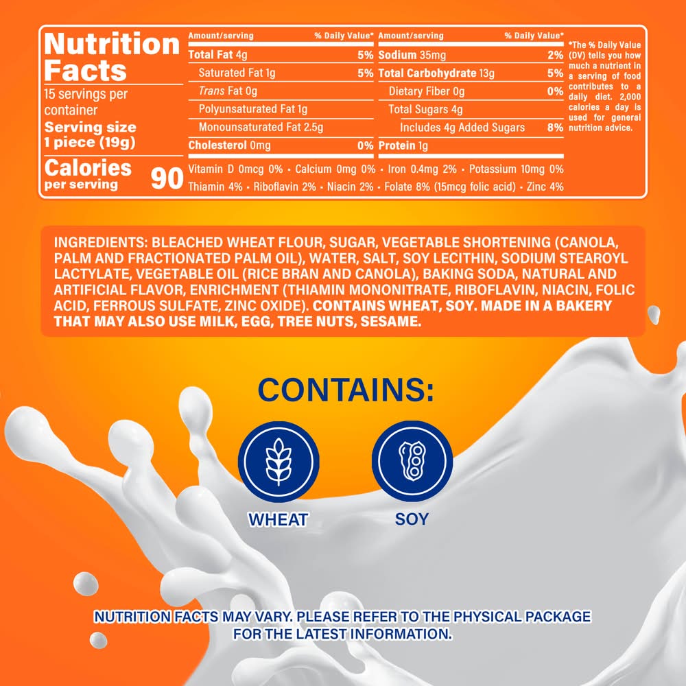 Ingredients: BLEACHED WHEAT FLOUR, SUGAR, VEGETABLE SHORTENING [CANOLA OIL, PALM AND FRACTIONATED PALM OIL], WATER, SALT, SOY LECITHIN, SODIUM STEAROYL LACTYLATE, VEGETABLE OIL [RICE BRAN OIL , CANOLA OIL ], BAKING SODA, NATURAL AND ARTIFICIAL FLAVOR, ENRICHMENT [THIAMIN MONONITRATE, RIBOFLAVIN, NIACIN, FOLIC ACID, FERROUS SULFATE, ZINC OXIDE], . Contains: CONTAINS SOY, WHEAT.