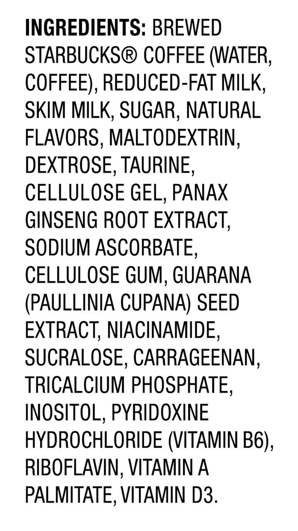 Ingredients: Brewed Starbucks Coffee (Water, Coffee), Reduced-Fat Milk, Skim Milk, Sugar, Natural Flavors, Maltodextrin, Dextrose, Taurine, Cellulose Gel, Panax Ginseng Root Extract, Sodium Ascorbate, Cellulose Gum, Guarana (Paullinia Cupana) Seed Extract, Niacinamide, Sucralose, Carrageenan, Tricalcium Phosphate, Inositol, Pyridoxine Hydrochloride (Vitamin B6), Riboflavin, Vitamin a Palmitate, Vitamin D3 Contains: Milk