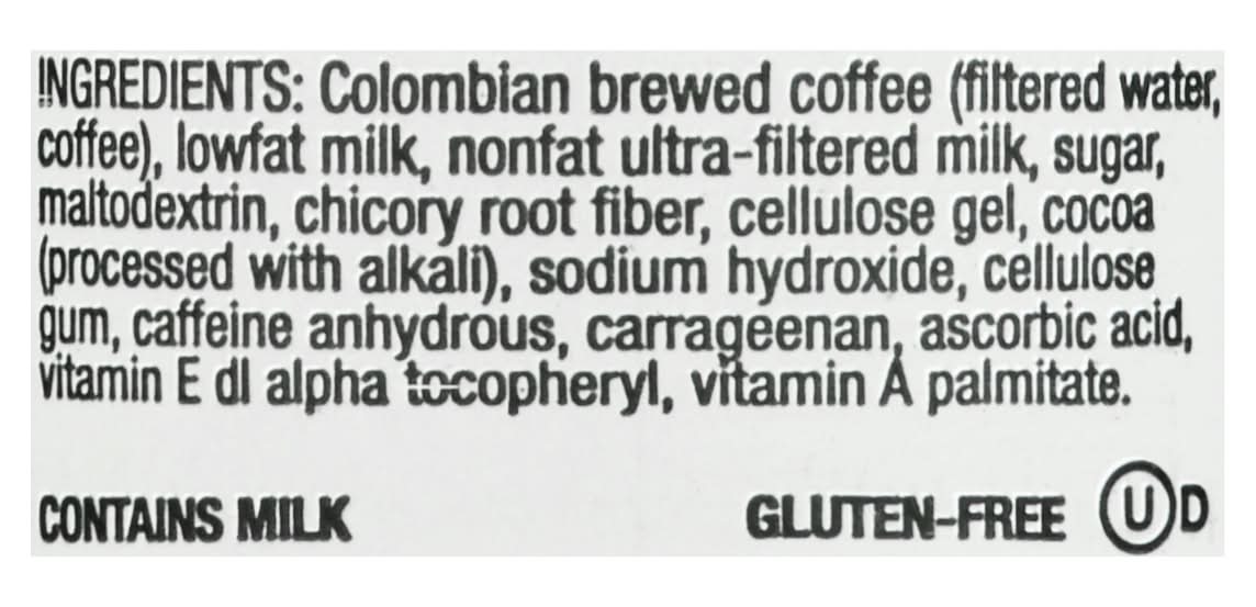 Ingredients: Colombian Brewed Coffee (Filtered Water, Coffee), Lowfat Milk, Nonfat Ultra-Filtered Milk, Sugar, Maltodextrin, Chicory Root Fiber, Cellulose Gel, Cocoa (Processed with Alkali), Sodium Hydroxide, Cellulose Gum, Caffeine Anhydrous, Carrageenan, Ascorbic Acid, Vitamin E Dl Alpha Tocopheryl, Vitamin A Palmitate Contains: Milk Contains 200mg of caffeine