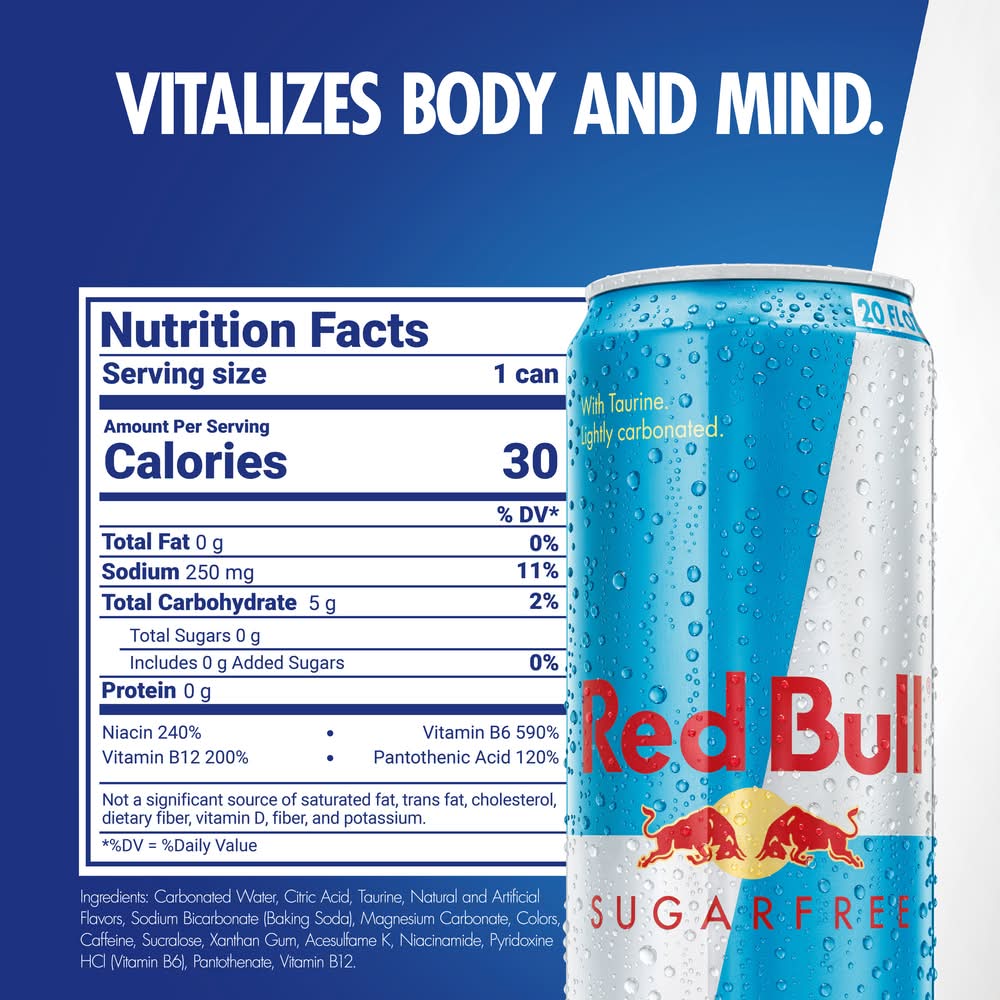 The sugar free version of the original energy drink that gives wings, this lightly carbonated beverage is enjoyed worldwide by fitness enthusiasts, athletes, gamers, students and travelers. A refreshing can makes an excellent partner for busy, active lifestyles. It also includes Taurine, an amino acid naturally occurring in the human body, and B-group vitamins B6, B12, Niacin (B3) and Pantothenic Acid (B5). Calcium and sugars values declared on labels may vary slightly depending on production locations. • Brand: Red bull • Red Bull North America, Inc., Santa Monica, CA ,90404 • Packaging: Reusable