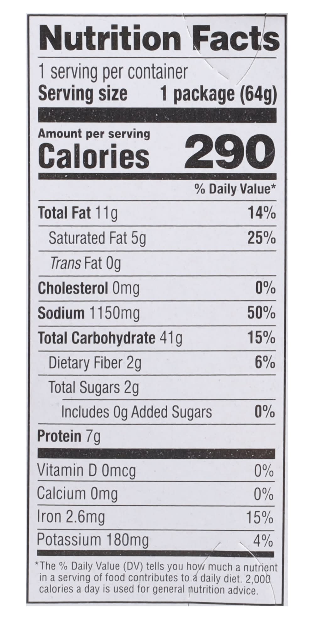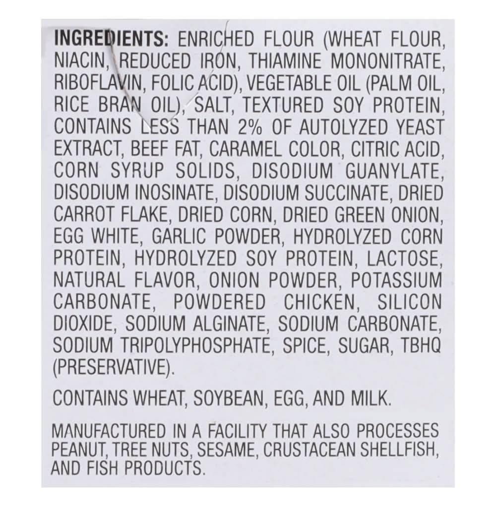 Ingredients: Enriched Flour (Wheat Flour Niacin Reduced Iron Thiamine Mononitrate Riboflavin Folic Acid), Vegetable Oil (Palm Oil Rice Bran Oil), Salt, Textured Soy Protein, Contains Less than 2% of Autolyzed Yeast Extract, Beef Fat, Caramel Color, Citric Acid, Corn Syrup Solids, Disodium Guanylate, Disodium Inosinate, Disodium Succinate, Dried Carrot Flake, Dried Corn, Dried Green Onion, Egg White, Garlic Powder, Hydrolyzed Corn Protein, Hydrolyzed Soy Protein, Lactose, Natural Flavor, Onion Powder, Potassium Carbonate, Powdered Chicken, Silicon Dioxide, Sodium Alginate, Sodium Carbonate, Sodium Tripolyphosphate, Spice, Sugar, TBHQ (Preservative) Contains: Wheat, Soybeans, Eggs, Milk, Corn, Lactose, Peanuts, Tree Nuts, Sesame, Crustacean Shellfish, Fish