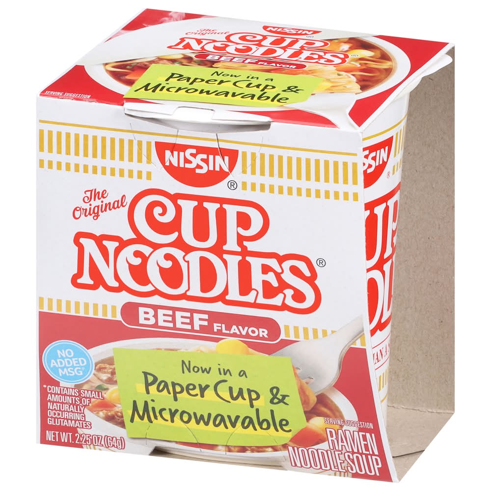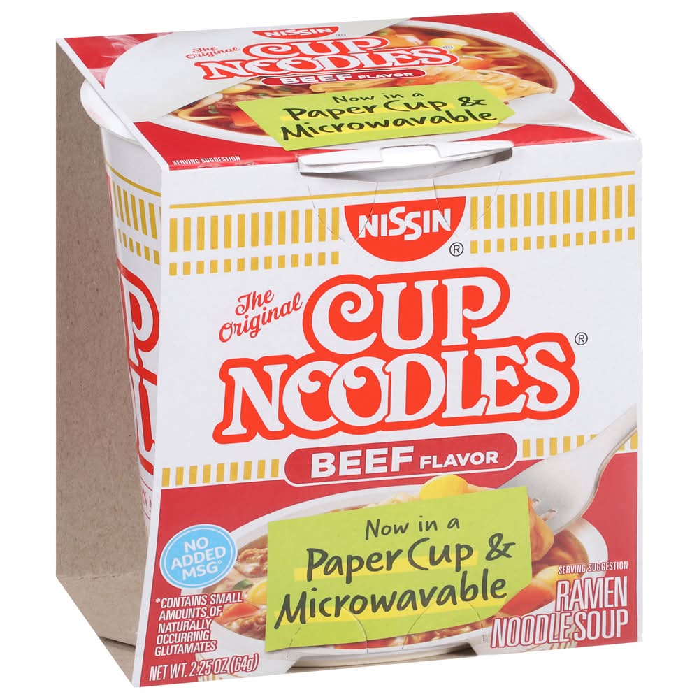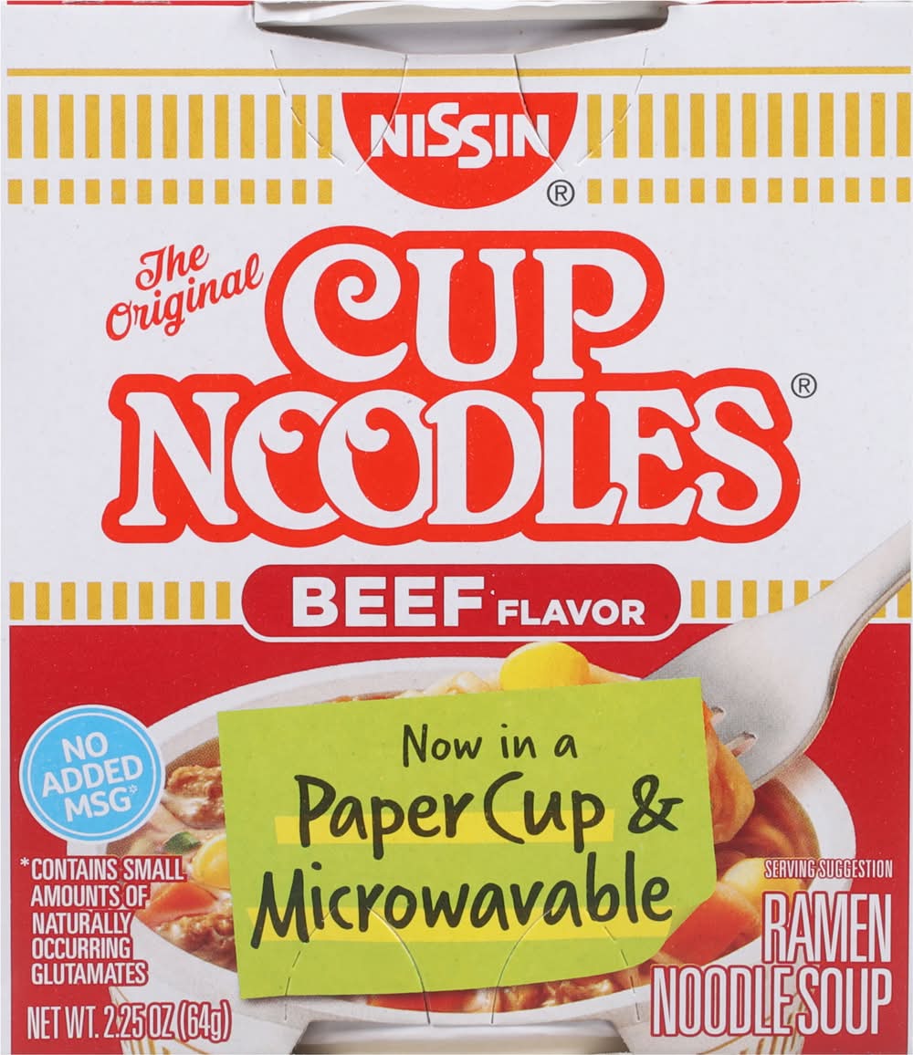 No added MSG (Contains small amounts of naturally occurring glutamates). Contains bioengineered food ingredients. The original. Now in a paper cup & microwavable. For the very best in ramen noodle soup. Microwaveable paper cup made with 40% recycled fiber. RSPO: Mixed - Certified sustainable palm oil. • Brand: Nissin • Flavor: Beef