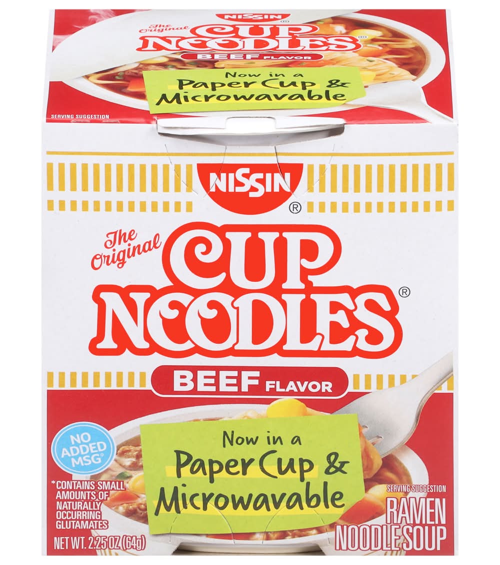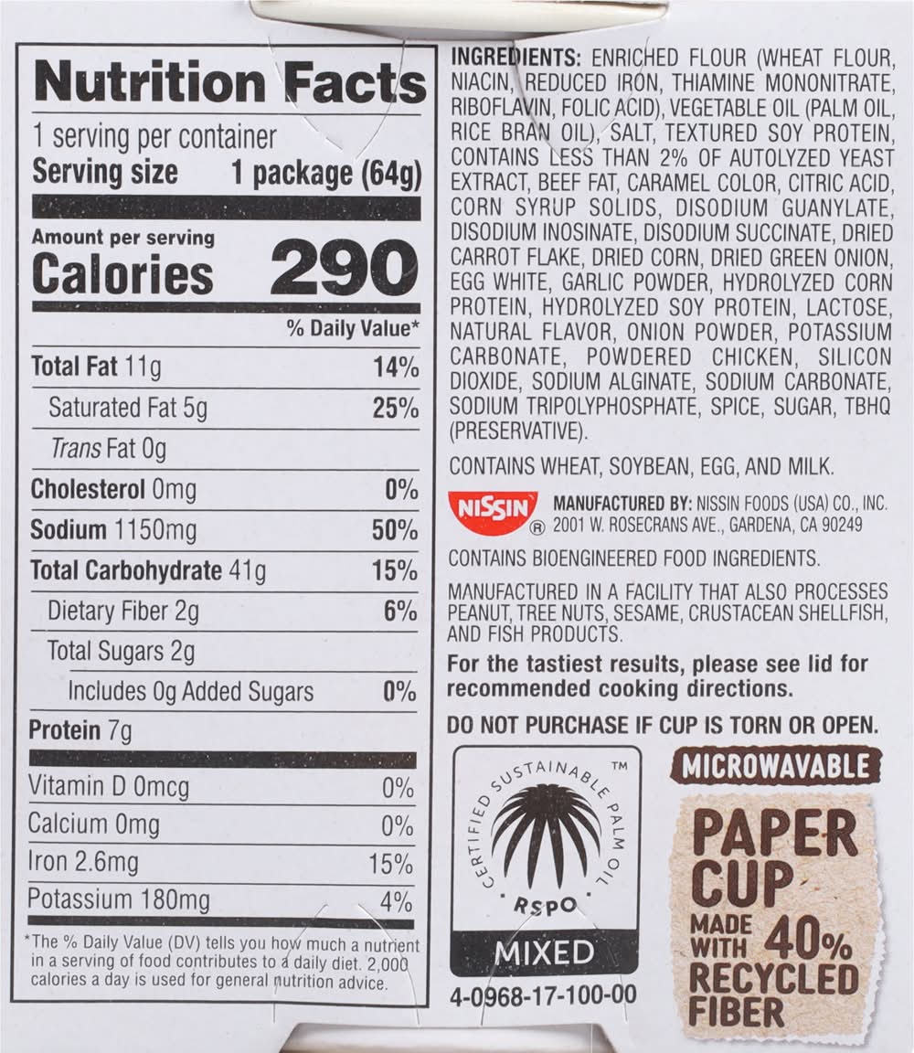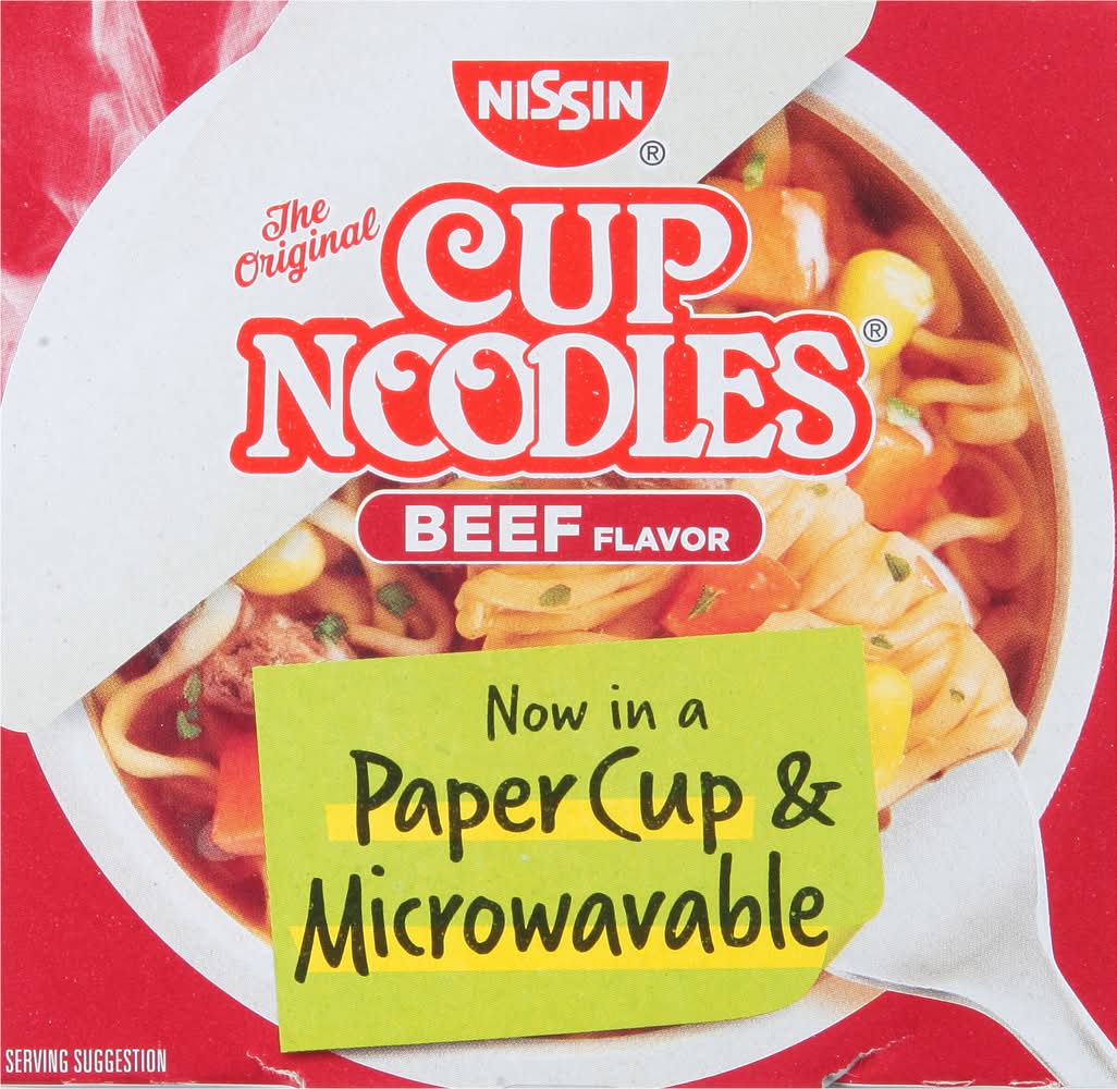 No added MSG (Contains small amounts of naturally occurring glutamates). Contains bioengineered food ingredients. The original. Now in a paper cup & microwavable. For the very best in ramen noodle soup. Microwaveable paper cup made with 40% recycled fiber. RSPO: Mixed - Certified sustainable palm oil. • Brand: Nissin • Flavor: Beef