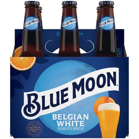 Crisp and tangy with subtle citrus sweetness, Blue Moon Belgian White is a Belgian-style wheat ale beer perfect for sharing. Full of zesty orange fruitiness, this citrus beer with 5.4% ABV boasts a creamy body and light spicy wheat aroma. Pick up a Blue Moon beer 6-pack anytime you or your friends need a refreshing drink. Crafted with Valencia orange peel, a touch of coriander, oats, and wheat, this light fruity beer provides a refreshing and balanced taste for every season. Blue Moon Belgian beer pairs well with many meals, including grilled seafood, salads, marinated chicken, and Asian dishes like pad thai. Grab a Blue Moon craft beer for watching the big game or sharing a meal with friends. Don't forget to garnish your Blue Moon beer bottles with an orange round to accentuate the beer's citrus aroma. Imagined in Belgium and crafted in Denver. • Brand: Blue moon • Pack size: 6 • kosher • Alcohol by volume: 5.4% • Packaging: Reusable