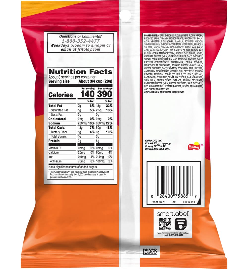 Ingredients: Corn, Enriched Flour (Wheat Flour, Niacin, Reduced Iron, Thiamin Mononitrate, Riboflavin, Folic Acid), Vegetable Oil (Corn, Canola, Soybean, And/Or Sunflower Oil), Enriched Corn Meal (Corn Meal, Ferrous Sulfate, Niacin, Thiamin Mononitrate, Riboflavin, Folic Acid), Whole Wheat, And Less Than 2% Of Salt, Brown Rice Flour, Corn Maltodextrin, Whole OAT Flour, Whey, Cheddar Cheese (Milk, Cheese Cultures, Salt, Enzymes), Sugar, Corn Syrup, Natural And Artificial Flavors, Whey Protein Concentrate, Buttermilk, Onion Powder, Monosodium Glutamate, Romano Cheese (Cow's Milk, Cheese Cultures, Salt, Enzymes), Potassium Salt, Lactose, Ammonium Bicarbonate, Corn Flour, Dextrose, Tomato Powder, Artificial Color (Yellow 6, Yellow 5, Red 40), Lactic Acid, Citric Acid, Yeast, Malt Syrup, Garlic Powder, Skim Milk, Spices, Yeast Extract, Sodium Caseinate, Parmesan Cheese (Milk, Cheese Cultures, Salt, Enzymes), Red And Green Bell Pepper Powder, Disodium Inosinate, And Disodium Guanylate. CONTAINS MILK AND WHEAT INGREDIENTS. Contains: CONTAINS MILK AND WHEAT INGREDIENTS.