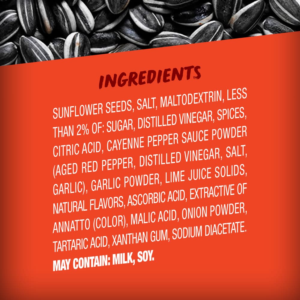 Ingredients: Sunflower Seeds, Salt, Maltodextrin, Less than 2% of: Sugar, Distilled Vinegar, Spices, Citric Acid, Cayenne Pepper Sauce Powder (Aged Red Pepper, Distilled Vinegar, Salt, Garlic), Garlic Powder, Lime Juice Solids, Natural Flavors, Ascorbic Acid, Extractive of Annatto (color), Malic Acid, Onion Powder, Tartaric Acid, Xanthan Gum, Sodium Diacetate. MAY CONTAIN: MILK, SOY. Contains: Any allergen, Milk, Soy