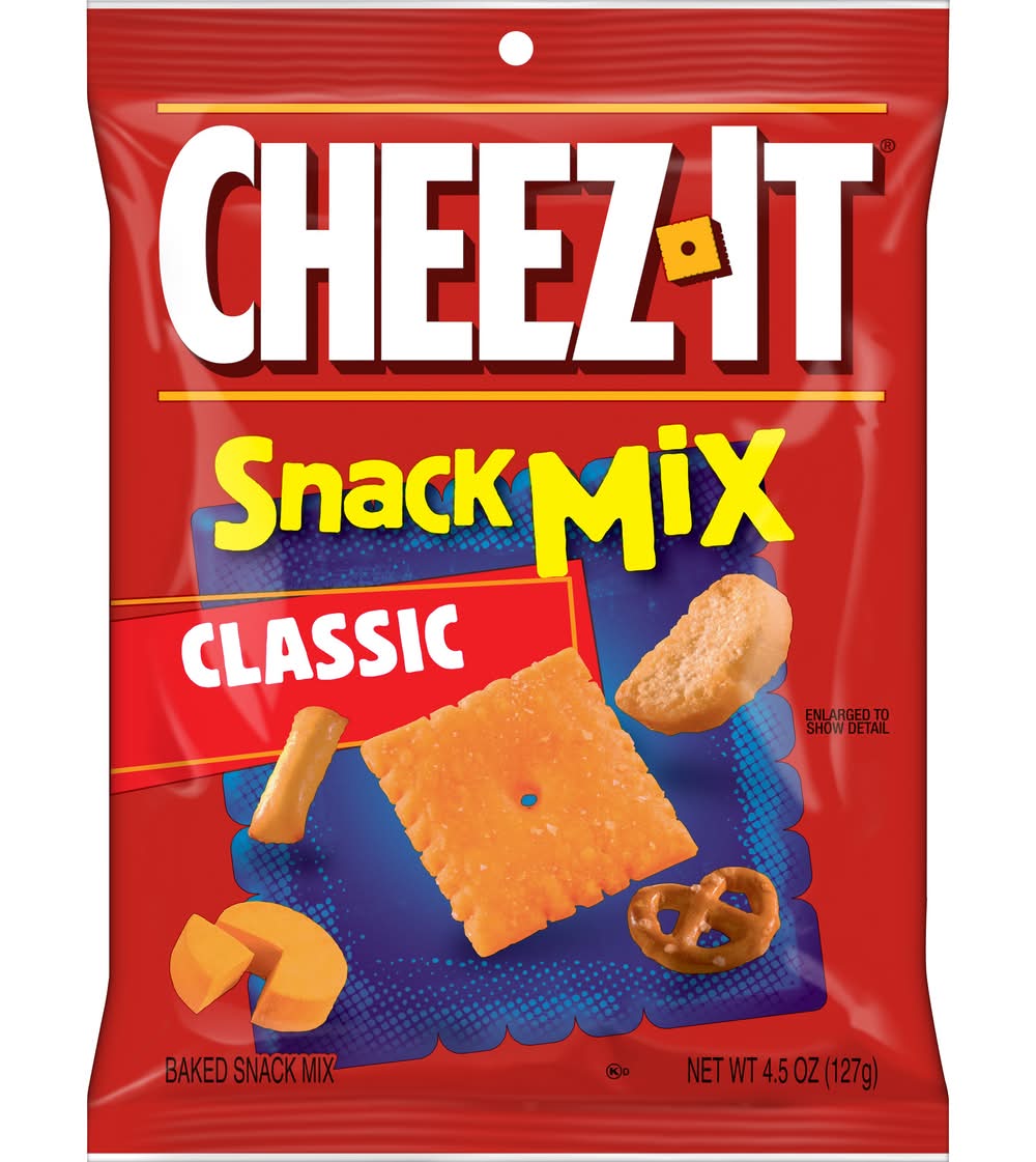 Satisfy snack time cravings with a delicious handful of Cheez-It Snack Mix Classic. Features a tasty combination of baked snack crackers made with 100% real cheese, salty pretzels, mini toasted bread slices, and cheese flavored rice puffs baked to crispy, crunchy perfection. This shareable pouch of baked snack mix makes it easier than ever to grab a snack on the way out the door. Perfectly sized for on-the-go snacking, as a flavorful addition to a packed lunch, or a quick bite around the house; Toss a pouch in your tote for a long commute, bring some snack mix in the car for a road trip, or stash them in your desk at the office for convenience. You can spice up everyday, out-of-the-home activities like field trips, camping, hiking, trips to the park, picnics, outdoor concerts, errands, and more by bringing along our Classic snack mix. No matter where you enjoy it you'll love the epically satisfying mix of flavors in every handful of Cheez-It Snack Mix Classic. • Brand: Cheez-it • Flavor: Classic • kosher • Number of servings: 4 • Kellogg Sales Co., Battle Creek, MI, 49016, Ph: 877-453-5837