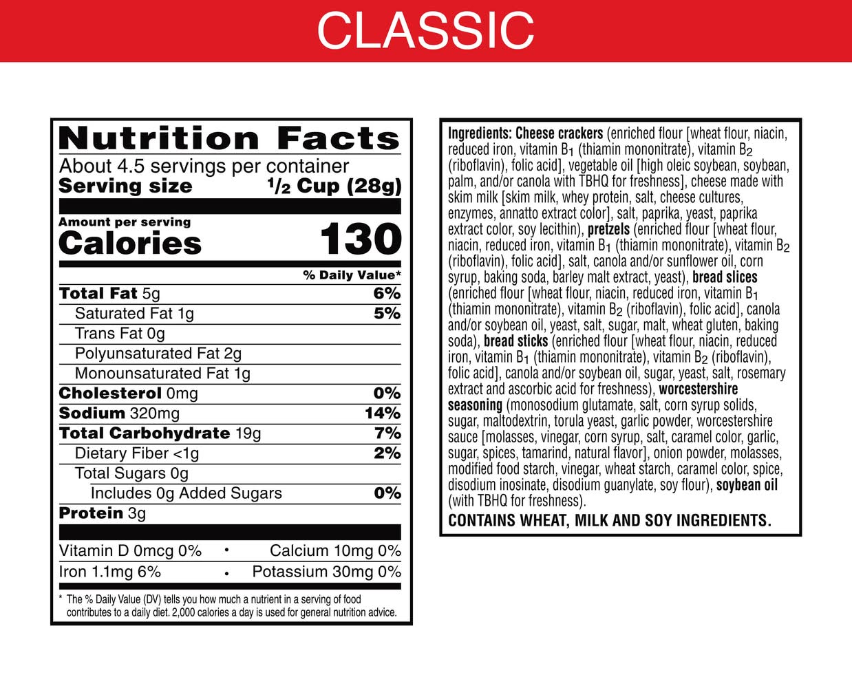 Ingredients: Cheese Crackers, Enriched Flour [Wheat Flour, Niacin, Reduced Iron, Vitamin B1 (Thiamin Mononitrate), Vitamin B2 (Riboflavin), Folic Acid], Vegetable Oil [High Oleic Soybean, Soybean, Palm, And/Or Canola With Tbhq For Freshness], Cheese Made With Skim Milk [Skim Milk, Whey Protein, Salt, Cheese Cultures, Enzymes, Annatto Extract Color], Salt, Paprika, Yeast, Paprika Extract Color, Soy Lecithin, Pretzels, Enriched Flour [Wheat Flour, Niacin, Reduced Iron, Vitamin B1 (Thiamin Mononitrate), Vitamin B2 (Riboflavin), Folic Acid], Salt, Canola And, Or Sunflower Oil, Corn Syrup, Baking Soda, Barley Malt Extract, Yeast, Bread Slices, Enriched Flour [Wheat Flour, Niacin, Reduced Iron, Vitamin B1 (Thiamin Mononitrate), Vitamin B2 (Riboflavin), Folic Acid], Canola And, Or Soybean Oil, Yeast, Salt, Sugar, Malt, Wheat Gluten, Baking Soda, Bread Sticks, Enriched Flour [Wheat Flour, Niacin, Reduced Iron, Vitamin B1 (Thiamin Mononitrate), Vitamin B2 (Riboflavin), Folic Acid], Canola And, Or Soybean Oil, Sugar, Yeast, Salt, Rosemary Extract And Ascorbic Acid For Freshness, Worcestershire Seasoning (Monosodium Glutamate, Salt, Corn Syrup Solids, Sugar, Maltodextrin, Torula Yeast, Garlic Powder, Worcestershire Sauce [Molasses, Vinegar, Corn Syrup, Salt, Caramel Color, Garlic, Sugar, Spices, Tamarind, Natural Flavor], Onion Powder, Molasses, Modified Food Starch, Vinegar, Wheat Starch, Caramel Color, Spice, Disodium Inosinate, Disodium Guanylate, Soy Flour), Soybean Oil (With Tbhq For Freshness), . Contains: Milk, Soybeans, Wheat, Gluten