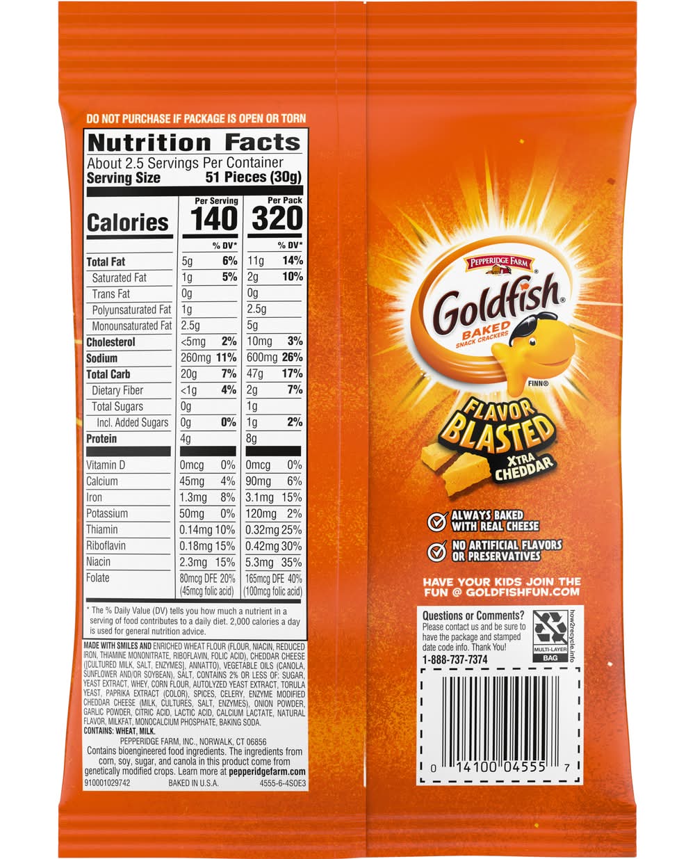 Like all goldfish crackers, these are baked with real cheese and made with no artificial flavors or preservatives. Talk about a feel good crunch. Grab a cheesy bag to add some fun to lunch or snack time. They also make an ideal to go snack when you need something satisfying to nibble on. Snack crackers will be a big hit when you're hanging with friends. • Brand: Goldfish • Flavor: Xtra cheddar • vegetarian • Pepperidge Farm, Inc., Norwalk, CT, 06856 • Packaging: Reusable