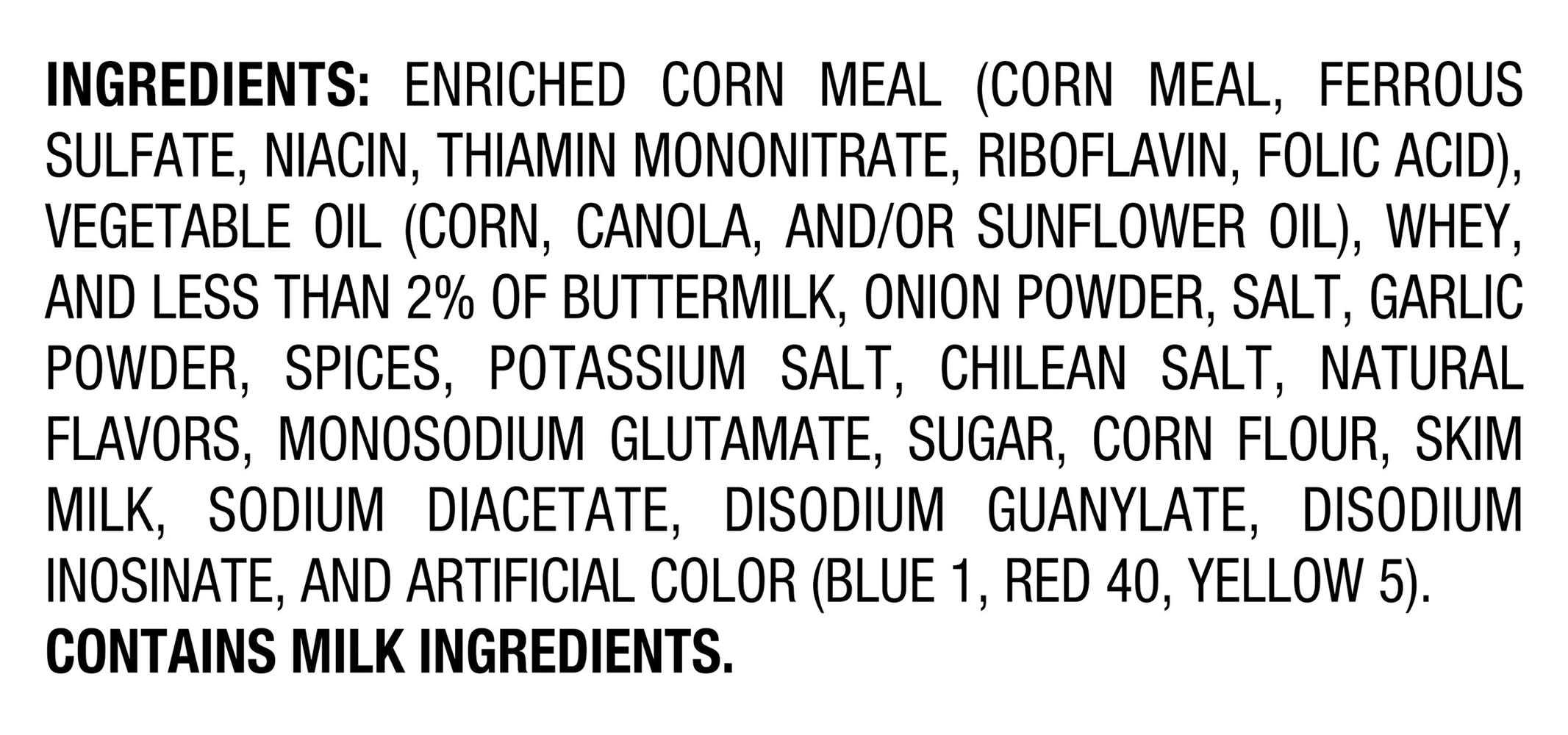 Ingredients: Enriched Corn Meal (Corn Meal, Ferrous Sulfate, Niacin, Thiamin Mononitrate, Riboflavin, Folic Acid), Vegetable Oil (Corn, Canola, and/or Sunflower Oil), Whey, and Less than 2% of Buttermilk, Onion Powder, Salt, Garlic Powder, Spices, Potassium Salt, Chilean Salt, Natural Flavors, Monosodium Glutamate, Sugar, Corn Flour, Skim Milk, Sodium Diacetate, Disodium Guanylate, Disodium Inosinate, and Artificial Color (Blue 1, Red 40, Yellow 5) Contains: Milk