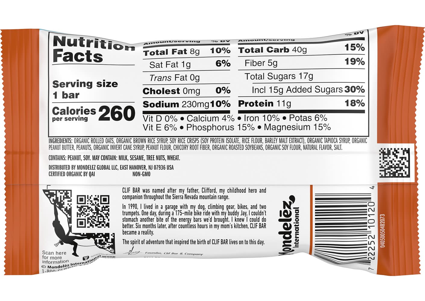 Born on a 175-mile bike ride, CLIF BAR energy bars are purposefully crafted with a mix of protein, fat, and carbohydrates to help sustain active bodies before and during long-lasting activity. CLIF BAR energy bars are made with quality ingredients like wholesome organic rolled oats and no high-fructose corn syrup, and they are non-GMO and plant-based for a granola bar you can feel good about. • Brand: Clif bar • Flavor: Crunchy peanut butter • GMO-free, organic • Clif Bar, Emeryville, CA 94608 USA