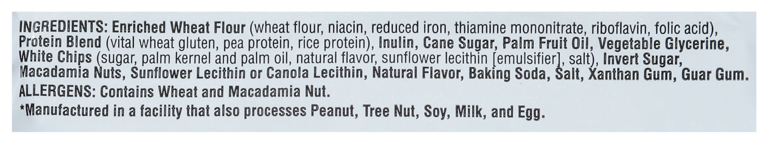 Ingredients: Enriched Wheat Flour (Wheat Flour, Niacin, Reduced Iron, Thiamine Mononitrate, Riboflavin, Folic Acid), Protein Blend (Vital Wheat Gluten, Pea Protein, Rice Protein), Cane Sugar, Inulin, Palm Fruit Oil, White Chips (Sugar, Palm Kernel and Palm Oil, Natural Flavor, Sunflower Lecithin [Emulsifier], Salt), Vegetable Glycerine, Invert Sugar, Macadamia Nuts, Sunflower Lecithin, Natural Flavor, Baking Soda, Salt, Xanthan Gum, Guar Gum Contains: Wheat, Tree Nuts, Peanuts, Soybeans, Milk, Eggs