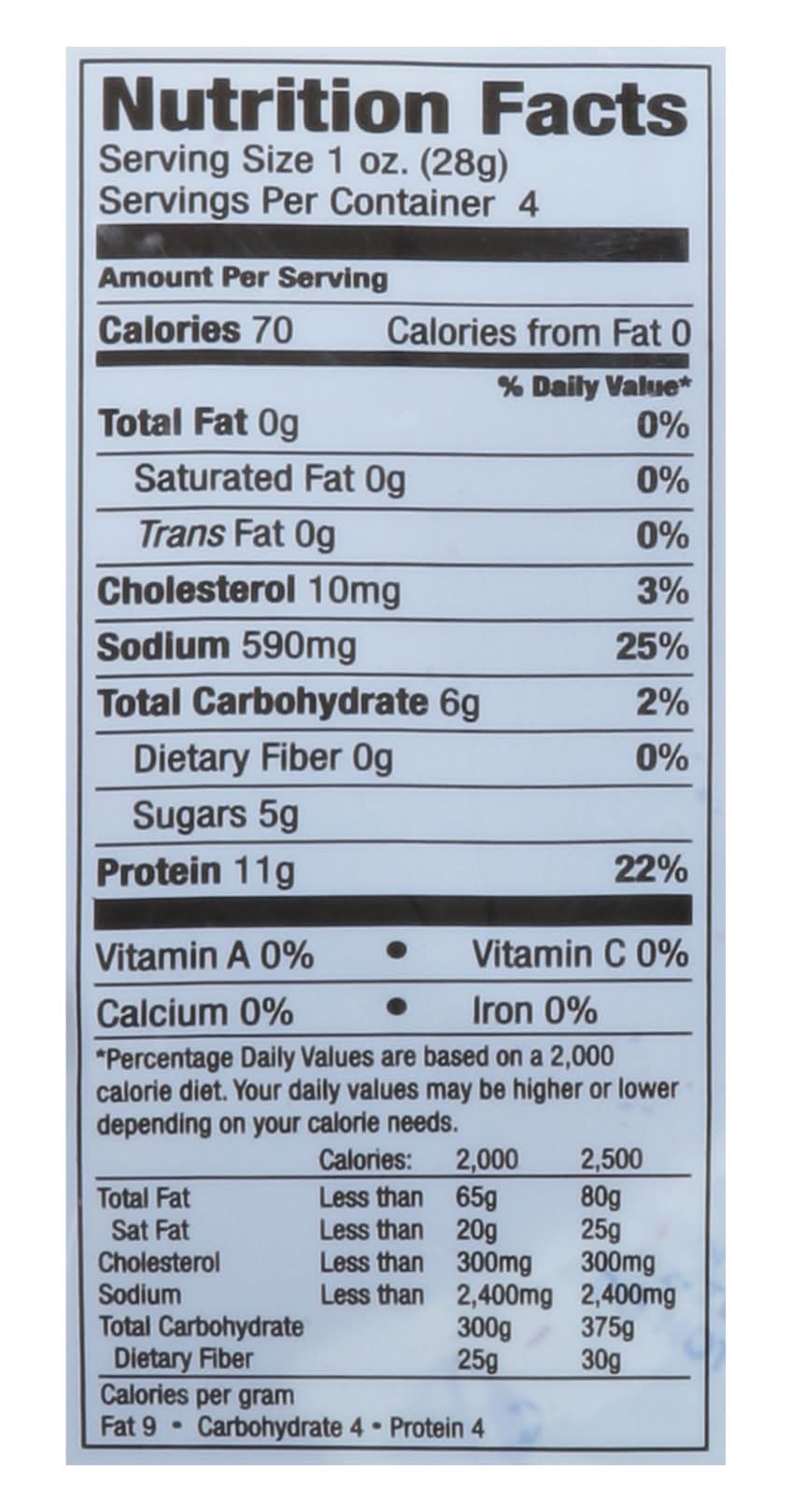 Ingredients: Beef, Brown Sugar, Water, Salt, Flavorings, Beef Stock, Hydrolyzed Corn Protein, Vinegar, Sodium Nitrite Contains: Corn
