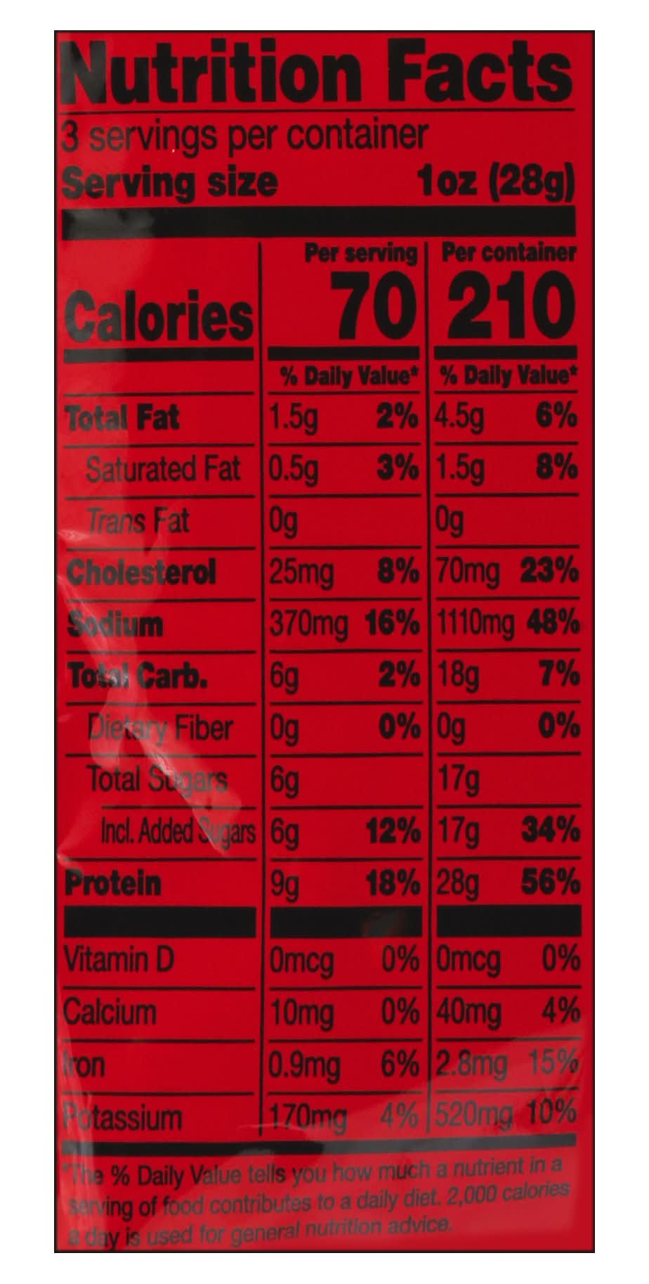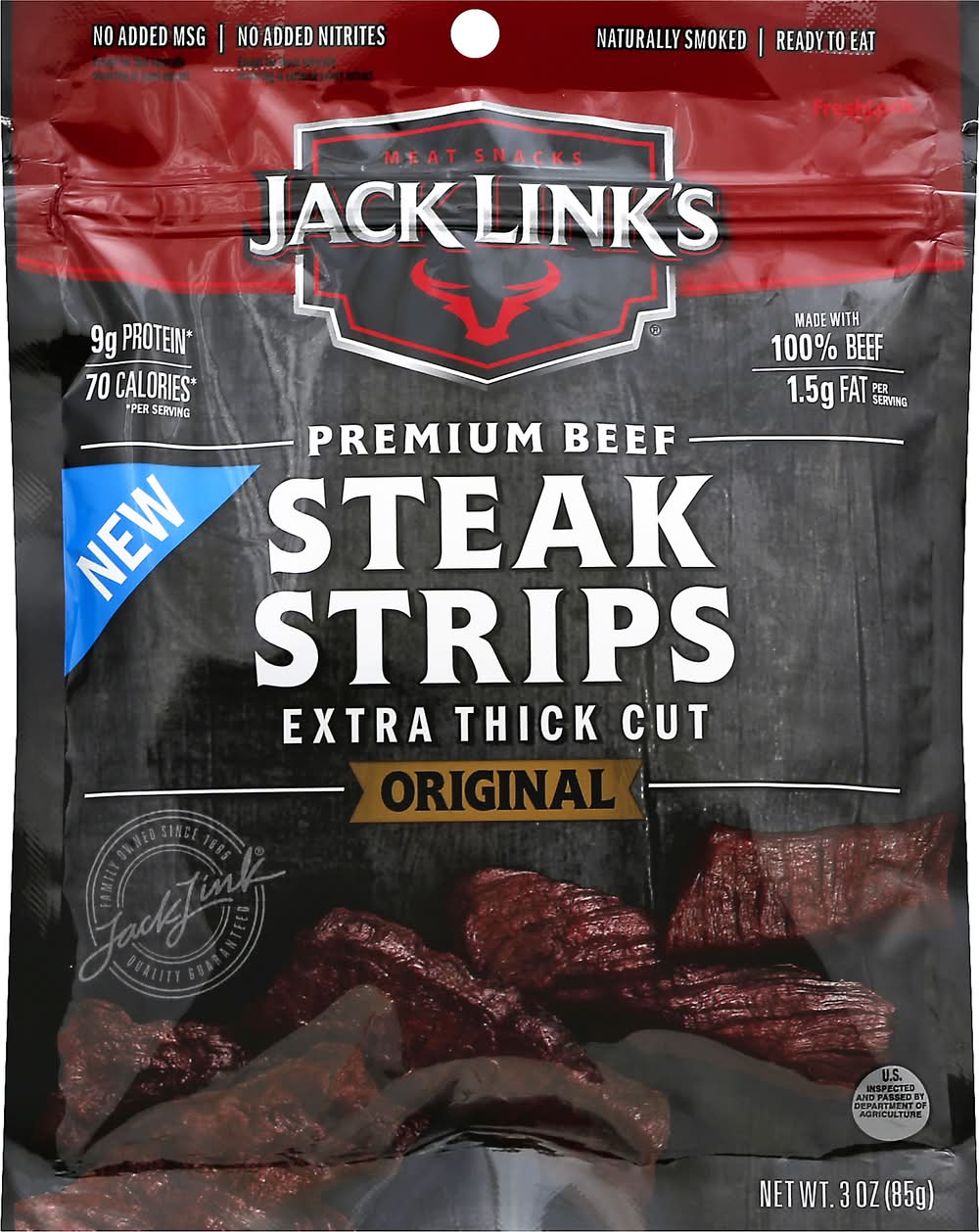 Seasoned, smoked & dried strips of beef. 9 g protein per serving. 70 calories per serving. 1.5 g fat per serving. Gluten free. No added msg (Except for that naturally occurring to yeast extract). No added nitrites (Except for those naturally occurring in cultured celery extract). Naturally smoked. Ready to eat. Made with 100% beef. New. Jack Link family owned since 1885. Jack Link's extra thick cut steak strips - everything you love about Jack Link's jerky, but thicker and heartier! Crafted from extra thick cuts of premium beef, these tender steak strips are deliciously seasoned and naturally hardwood smoked, for an exceptionally hearty snack that's sure to satisfy. Born in the Northwoods of Wisconsin with nothing more than a passion for great tasting snacks, our company has been family owned and operated for over 100 years. We're proud of our rural roots, and hope you enjoy the delicious tradition that continues today. From all of us at Jack Link's, thank you for your patronage, and remember to Feed your wild side! Feed your wild side. Satisfaction Guaranteed: This product is guaranteed to satisfy or we'll replace it (With proof of purchase). US inspected and passed by Department of Agriculture. • Brand: Jack link's • gluten-free