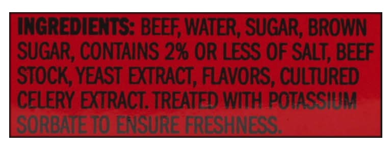 Ingredients: Beef, Water, Sugar, Brown Sugar, Contains 2% or Less of Salt, Beef Stock, Yeast Extract, Flavors, Cultured Celery Extract, Treated with Potassium Sorbate to Ensure Freshness