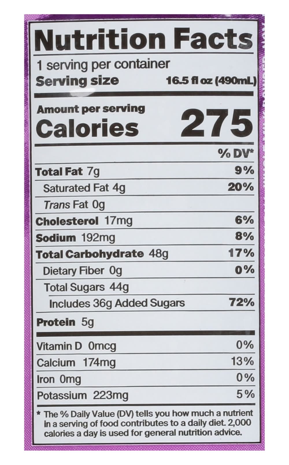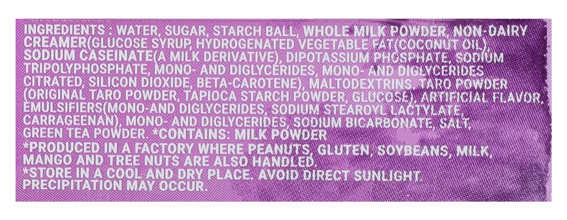 Ingredients: Water, Sugar, Starch Ball, Whole Milk Powder Non-Dairy Creamer(Glucose Syrup, Hydrogenated Vegetable Fat(Coconut Oil), Sodium Caseinate(a Milk Derivative), Dipotassium Phosphate, Sodium Tripolyphosphate, Mono- and Diglycerides, Mono- and Diglycerides Citrated, Silicon Dioxide, Beta-Carotene), Maltodextrins, Taro Powder (Original Taro Powder, Tapioca Starch Powder, Glucose), Artificial Flavor, Emulsifiers(Mono-and Diglycerides, Sodium Stearoyl Lactylate, Carrageenan), Mono- and Diglycerides, Sodium Bicarbonate, Salt Green Tea Powder Contains: Milk, Tree Nuts, Coconuts, Peanuts, Gluten, Soybeans