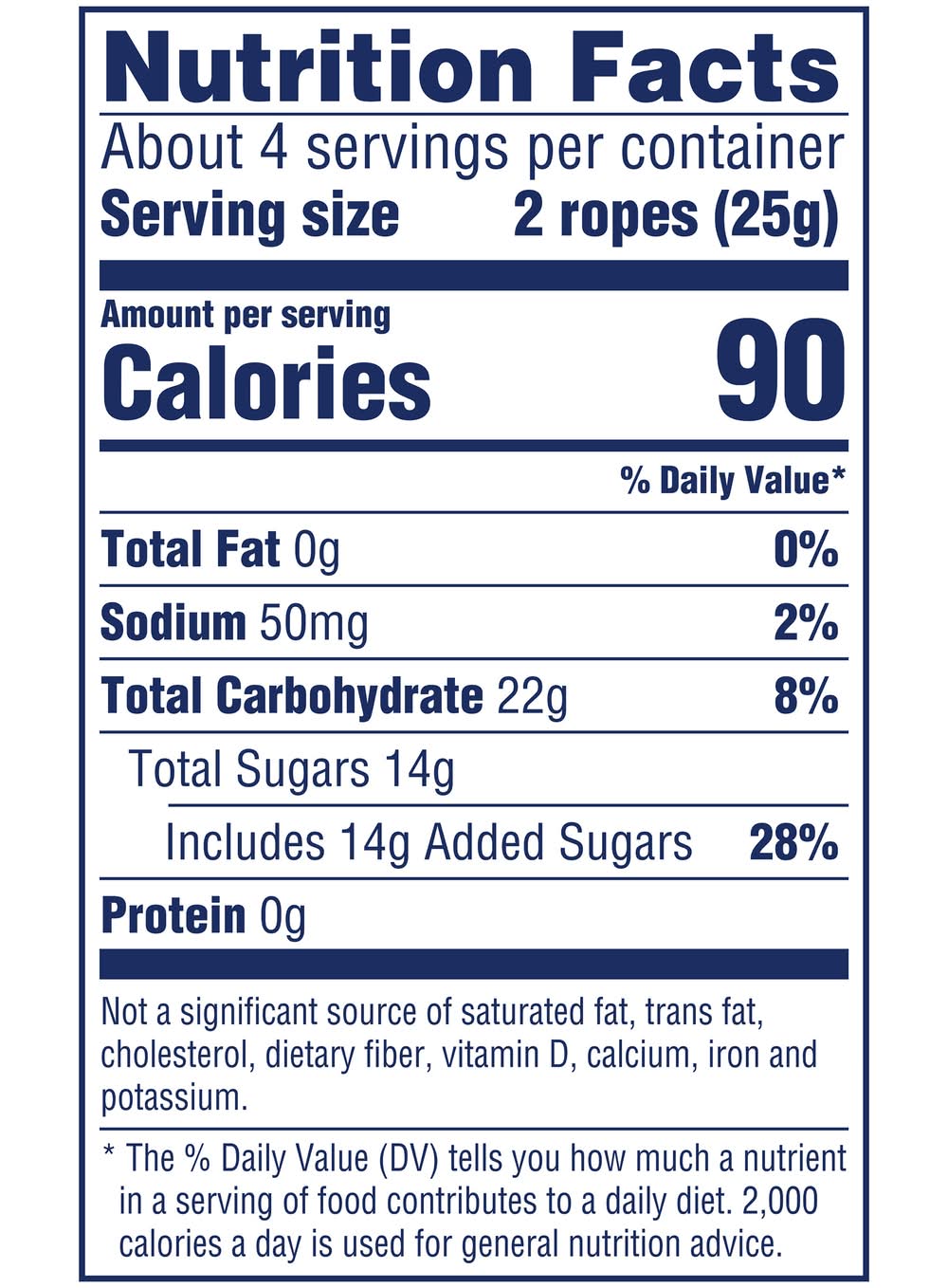 Sweetarts Soft & Chewy Ropes offer a fruity flavor experience with each piece. Derived from real sources, the colors add to the visual appeal of this candy. Designed to be soft and chewy, each rope provides a satisfying texture. The product contains approximately four servings per container, with each serving consisting of two ropes and totaling 90 calories. These treats are produced in Mexico. • Brand: Sweetarts • Flavor: Twisted rainbow punch • Number of servings: 4 • Ferrara Candy Company, Chicago, IL, 60607, Ph: 866-793-3827
