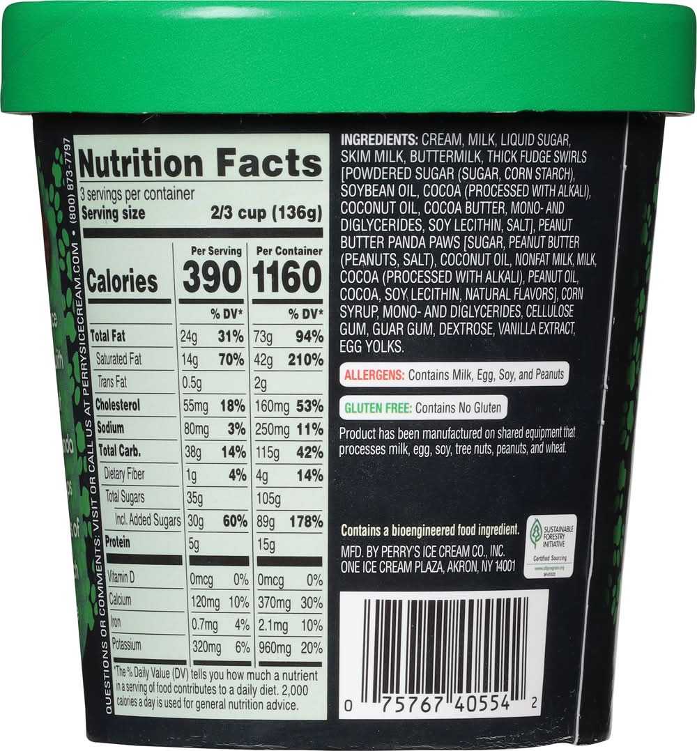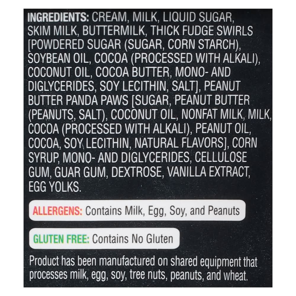 Ingredients: Cream, Milk, Liquid Sugar, Skim Milk, Buttermilk, Thick Fudge Swirls [Powdered Sugar (Sugar, Corn Starch), Soybean Oil, Cocoa (Processed with Alkali), Coconut Oil, Cocoa Butter, Mono- and Diglycerides, Soy Lecithin, Salt], Peanut Butter Panda Paws [Sugar, Peanut Butter (Peanuts, Salt), Coconut Oil, Nonfat Milk, Milk, Cocoa (Processed with Alkali), Peanut Oil, Cocoa, Soy Lecithin, Natural Flavors], Corn Syrup, Mono- and Diglycerides, Cellulose Gum, Guar Gum, Dextrose, Vanilla Extract, Egg Yolks Contains: Milk, Eggs, Soybeans, Peanuts, Corn, Tree Nuts, Coconuts, Tree Nuts, Wheat