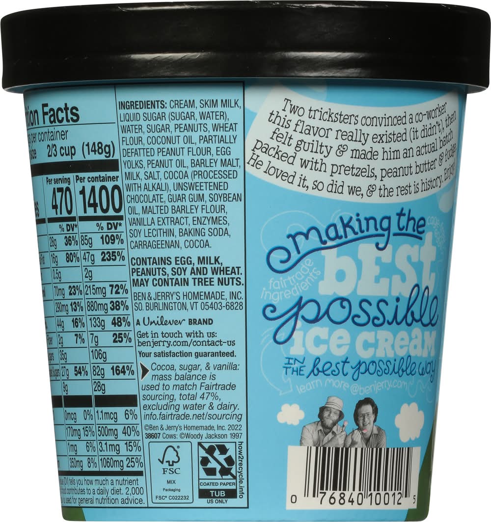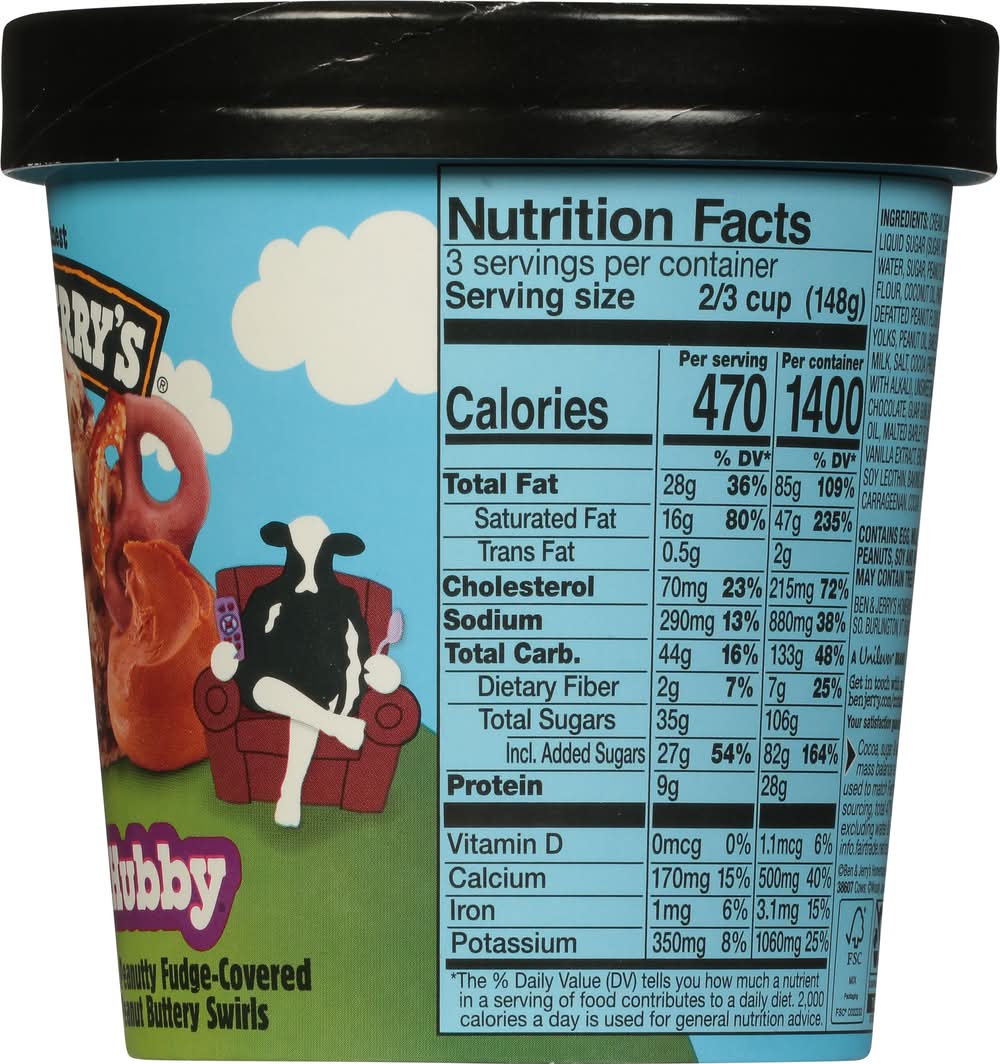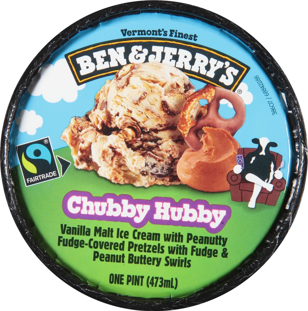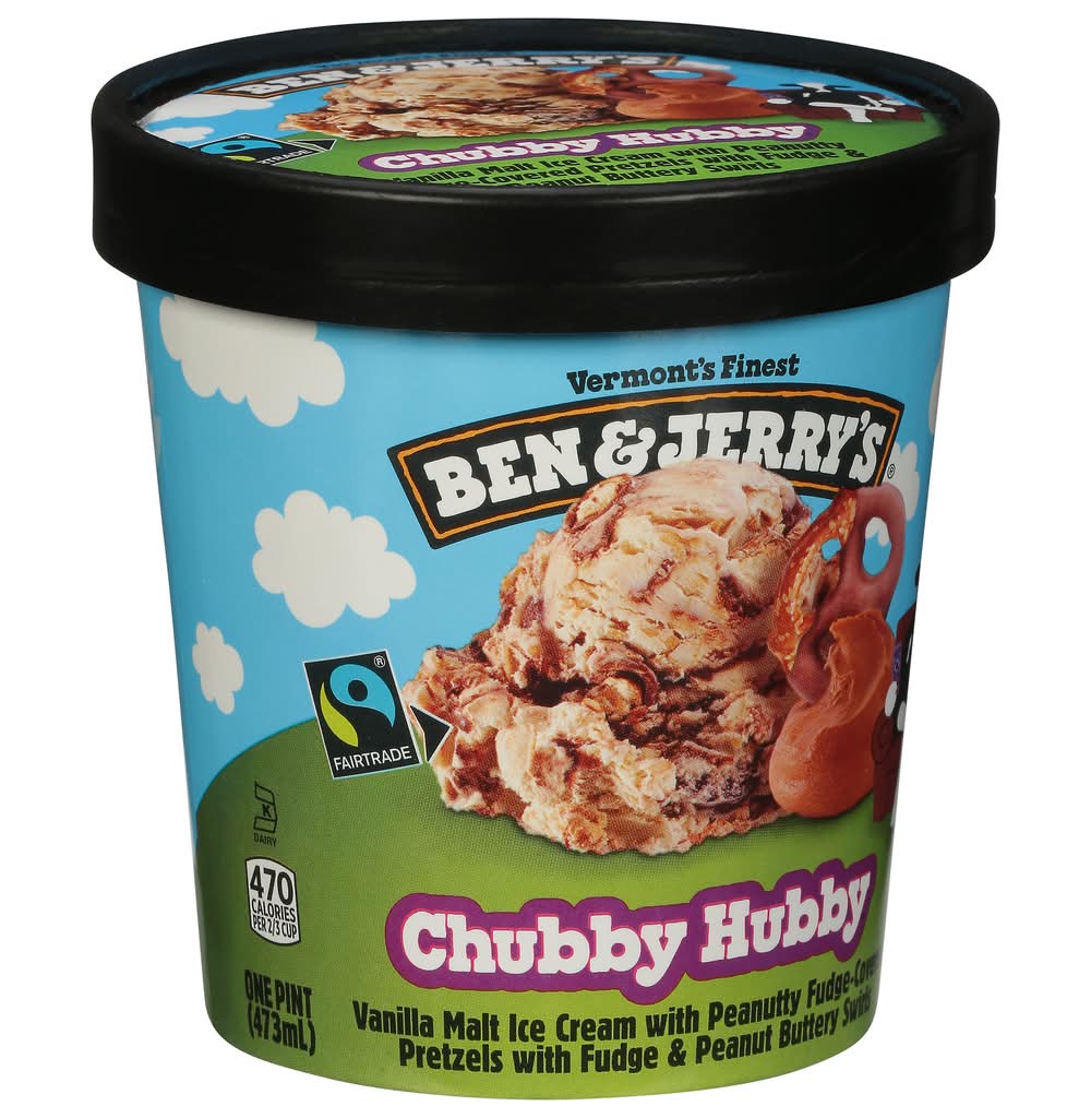 combined with peanutty fudge-covered pretzels, enriched with fudge and peanut butter swirls. It is crafted using Fairtrade certified cocoa, sugar, and vanilla, accounting for 47% of its total contents, excluding water and dairy. This ice cream is produced with a commitment to making the best possible product in the most responsible way. It comes in a 2/3 cup serving and is packaged in FSC Mix packaging. • Brand: Ben & jerry's • Flavor: Chubby hubby • kosher