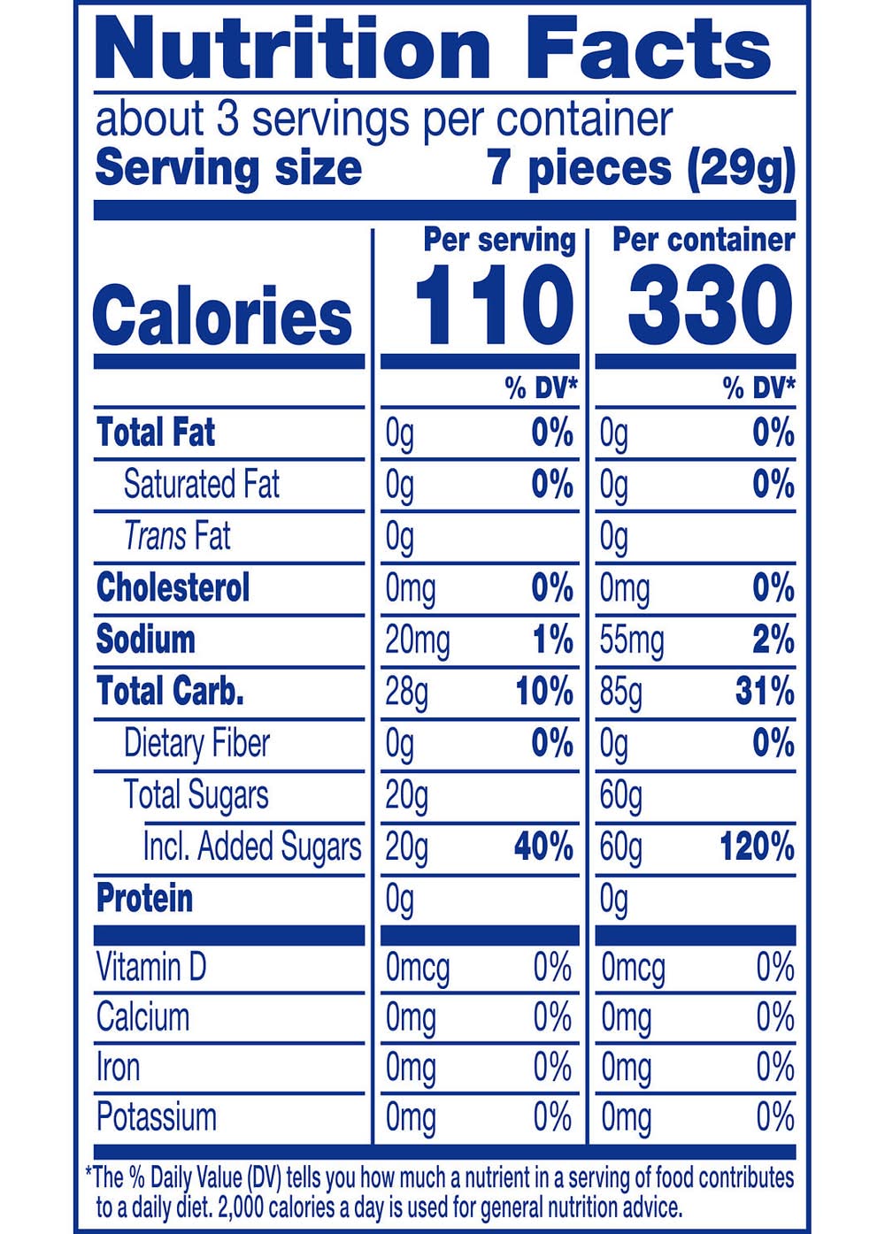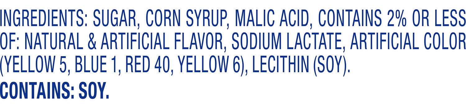 Ingredients: SUGAR, CORN SYRUP, MALIC ACID, CONTAINS 2% OR LESS OF: NATURAL ARTIFICIAL FLAVOR, SODIUM LACTATE, ARTIFICIAL COLOR (YELLOW 5, BLUE 1, RED 40, YELLOW 6), LECITHIN (SOY), . Contains: Soy Additives: Artificial Flavors