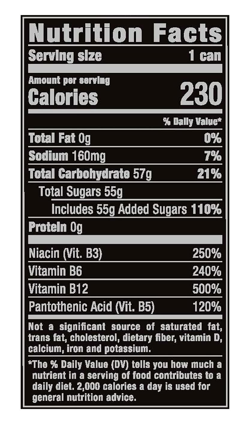 Ingredients: Carbonated Water, High Fructose Corn Syrup, Citric Acid, Sugar, Natural & Artificial Flavors, Sodium Citrate, Sodium Benzoate (Preservative), D-Ribose, Caffeine, Gum Arabic, Niacinamide (Vit. B3), Calcium D-Pantothenate (Vit. B5), Ester Gum, Pyridoxine Hydrochloride (Vit. B6), Yellow 5, Cyanocobalamin (Vit. B12) Contains: Corn