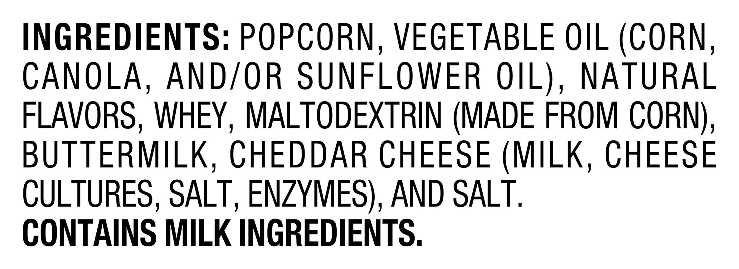 Ingredients: Popcorn, Vegetable Oil (Corn Canola and/or Sunflower Oil), Natural Flavors, Whey, Maltodextrin (Made from Corn), Buttermilk, Cheddar Cheese (Milk Cheese Cultures Salt Enzymes), and Salt Contains: Corn, Milk
