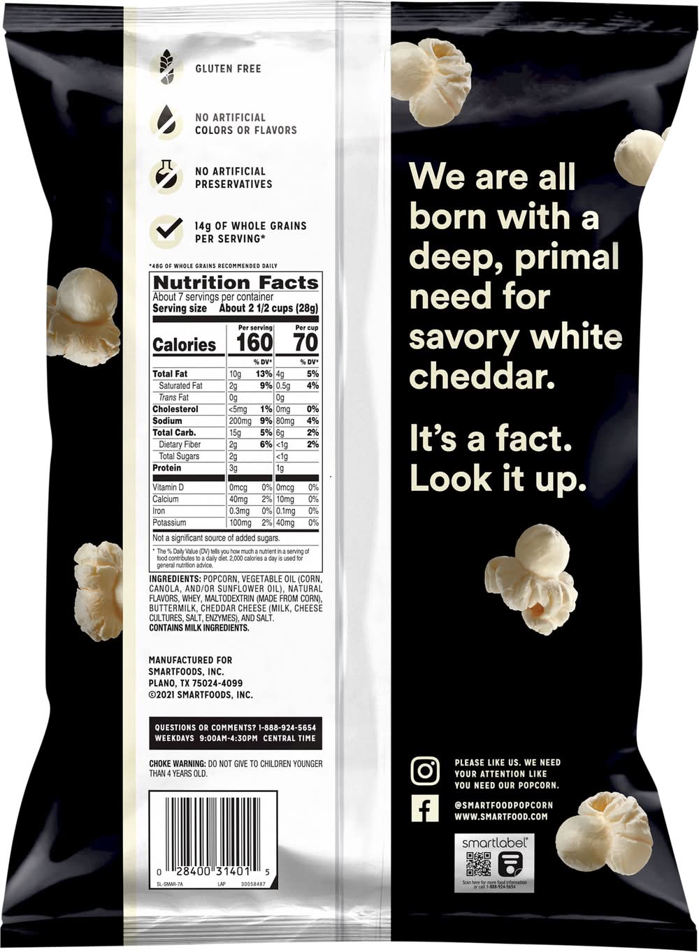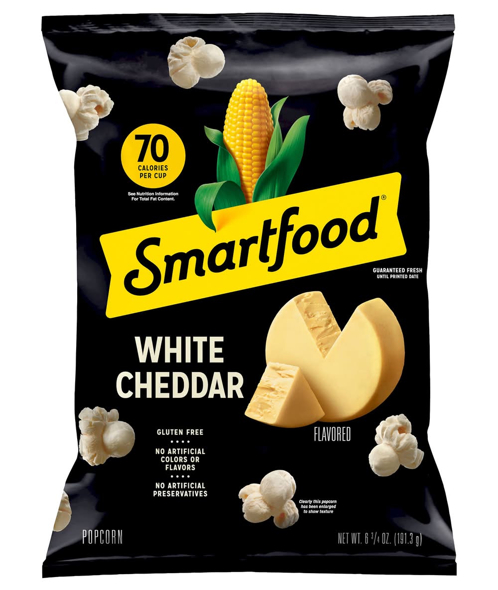 No artificial preservatives. We are all born with a deep, primal need for savory white cheddar. It's a fact. • Brand: Smartfood • Flavor: White cheddar • gluten-free • Smartfoods, Inc., Plano,TX,75024-4099