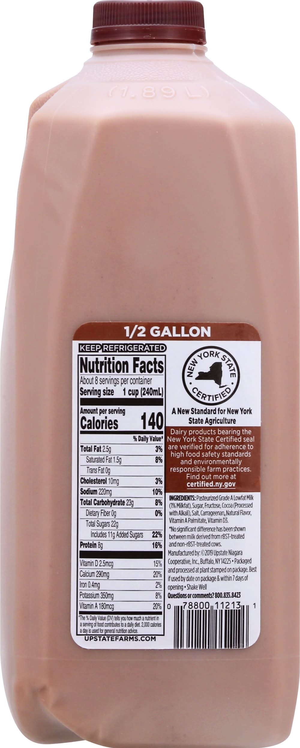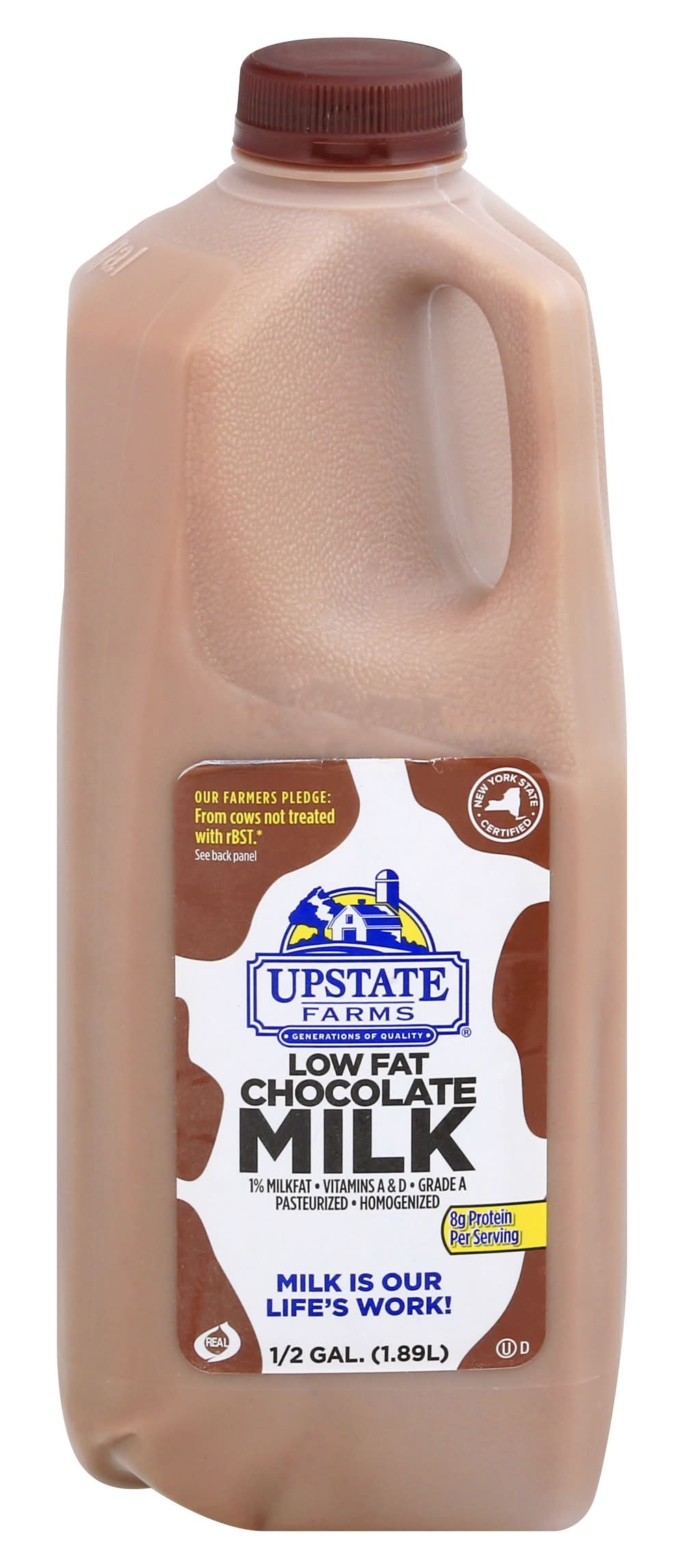 8 g protein per serving. Low fat. 1% milkfat. Vitamin A & D. Our farmers pledge: From cows not treated with rBST (No significant difference has been shown between milk derived from rBST-treated and non-rBST-treated cows). New York State certified. Generations of quality. Pasteurized. Homogenized. Milk is our life's work! Real. Packaged and processed at plant stamped on package. Grade A. A new standard for New York State Agriculture. Dairy products bearing the New York State Certified seal are verified for adherence to high food safety standards and environmentally responsible farm practices. Find our more at certified.ny.gov. • Brand: Upstate farms • Flavor: Chocolate • kosher, low fat