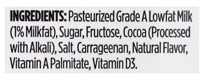 Ingredients: Pasteurized Grade A Lowfat Milk (1% Milkfat), Sugar, Fructose, Cocoa (Processed with Alkali), Salt, Carrageenan, Natural Flavor, Vitamin A Palmitate, Vitamin D3 Contains: Milk