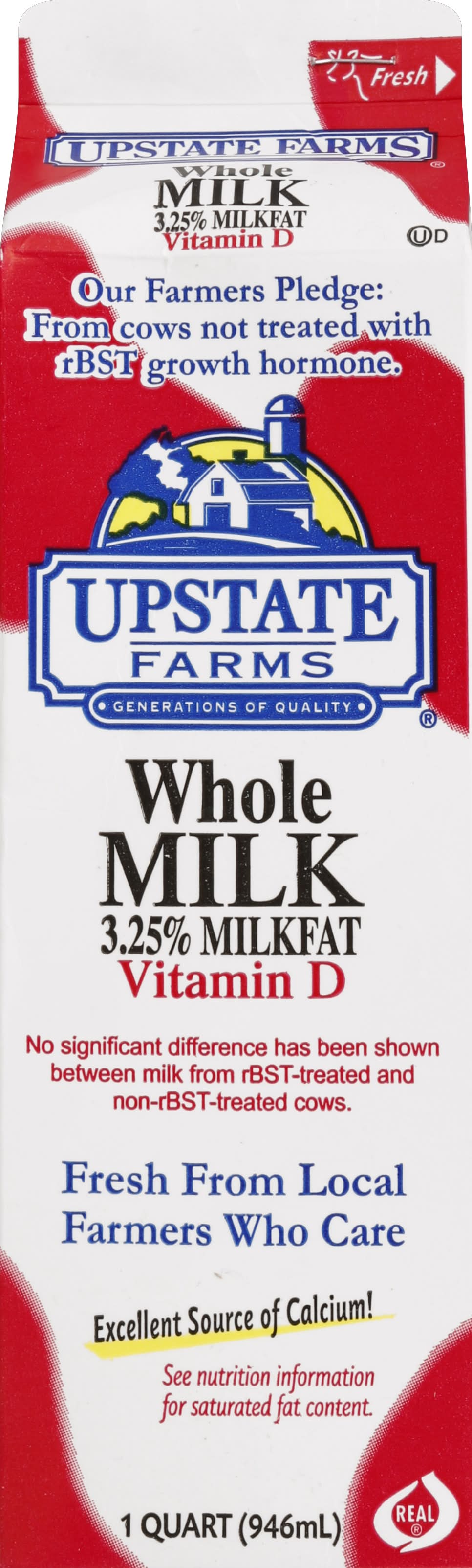 Vitamin D. Grade A. Pasteurized. Homogenized. Fresh from local farmers who care. Excellent source of calcium! Generations of quality. Our farmers pledge: from cows not treated with rBST growth hormone. No significant difference has been shown between milk from rBST-treated and non-rBST treated cows. Thank you for choosing Upstate Farms. The Thompson Farm began in 1815 as a part of the original Holland Land Company. We currently milk 100 cows and grow corn, forages and barley for the dairy operation. The farm received the Dairy of Distinction award in 1996 and was honored by the NYS Agricultural Society with the NYC Century Farm award, in 2003. With the fifth generation now on our farm, continuing with a positive attitude and always eager for innovation and success, hopefully the Thompson Farm will be here for 100 more years. -Jeff & Kathy. • Brand: Upstate farms • kosher