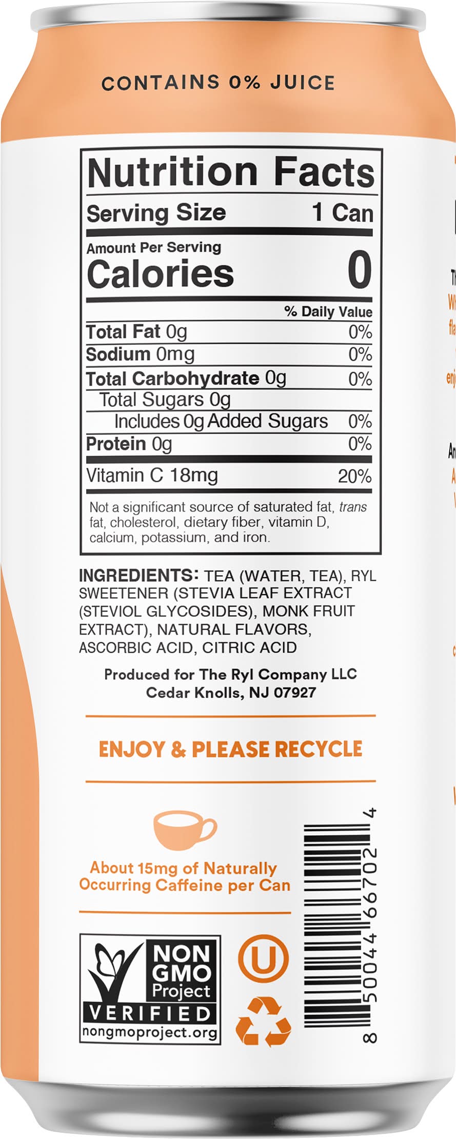 Ingredients: Tea (Water, Tea), Ryl Sweetener (Stevia Leaf Extract (Steviol Glycosides), Monk Fruit Extract), Natural Flavors, Ascorbic Acid, Citric Acid