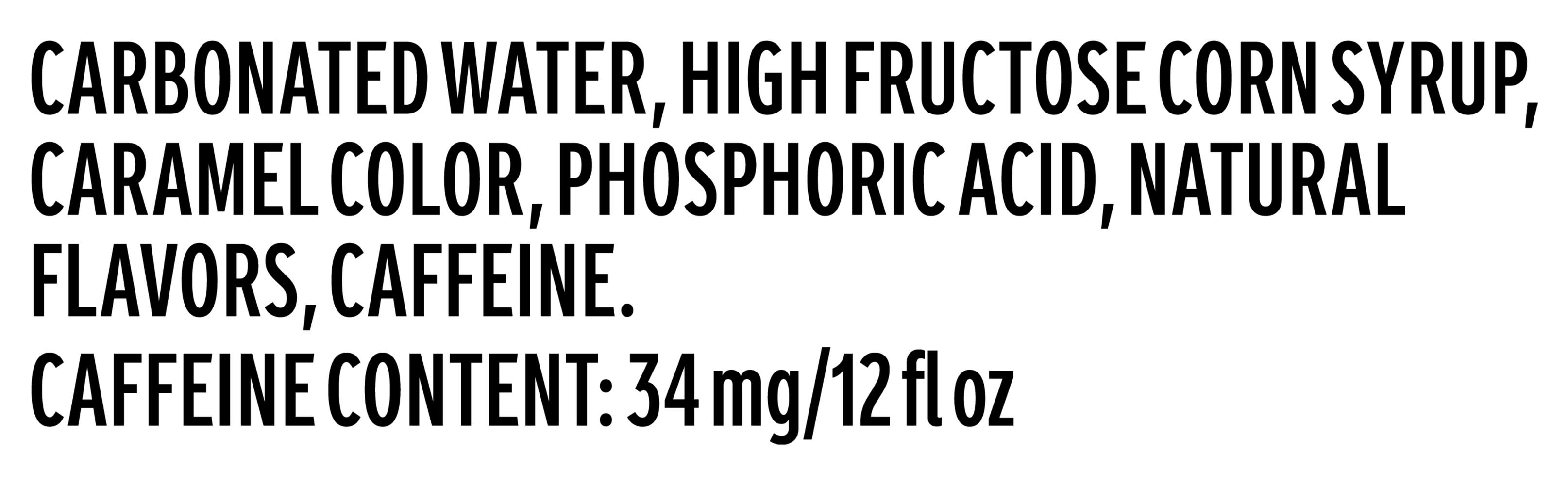 Ingredients: Carbonated Water, High Fructose Corn Syrup, Caramel Color, Phosphoric Acid, Natural Flavors, Caffeine. Contains: Corn