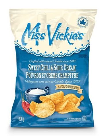 Miss Vickie’s Sweet Chili & Sour Cream flavour kettle cooked potato chips offers a rich taste experience that begins with a mild chili pepper spice. Brand: Miss vickie's