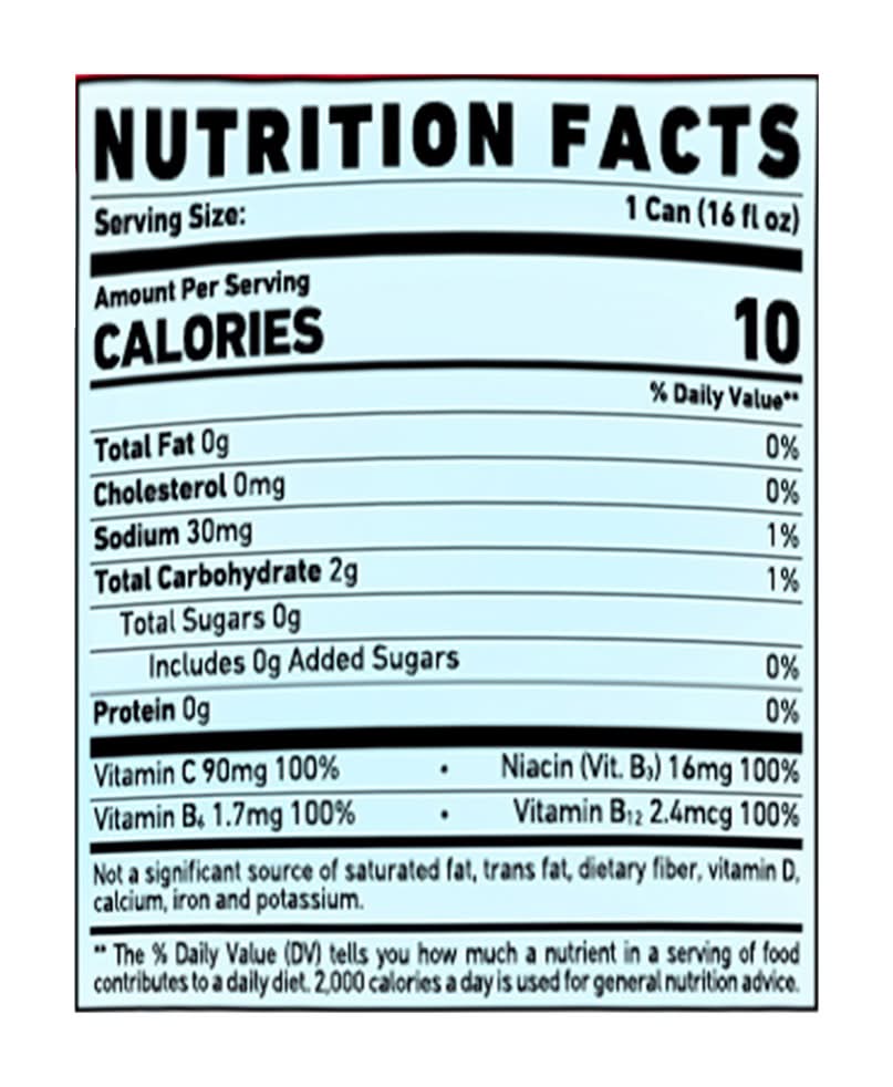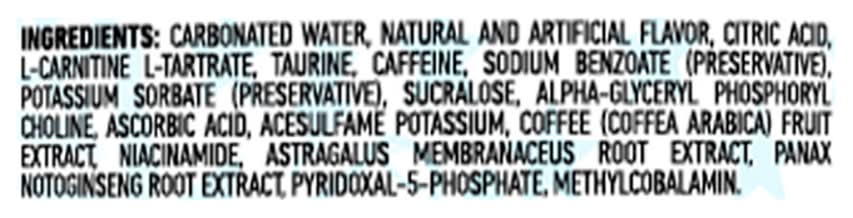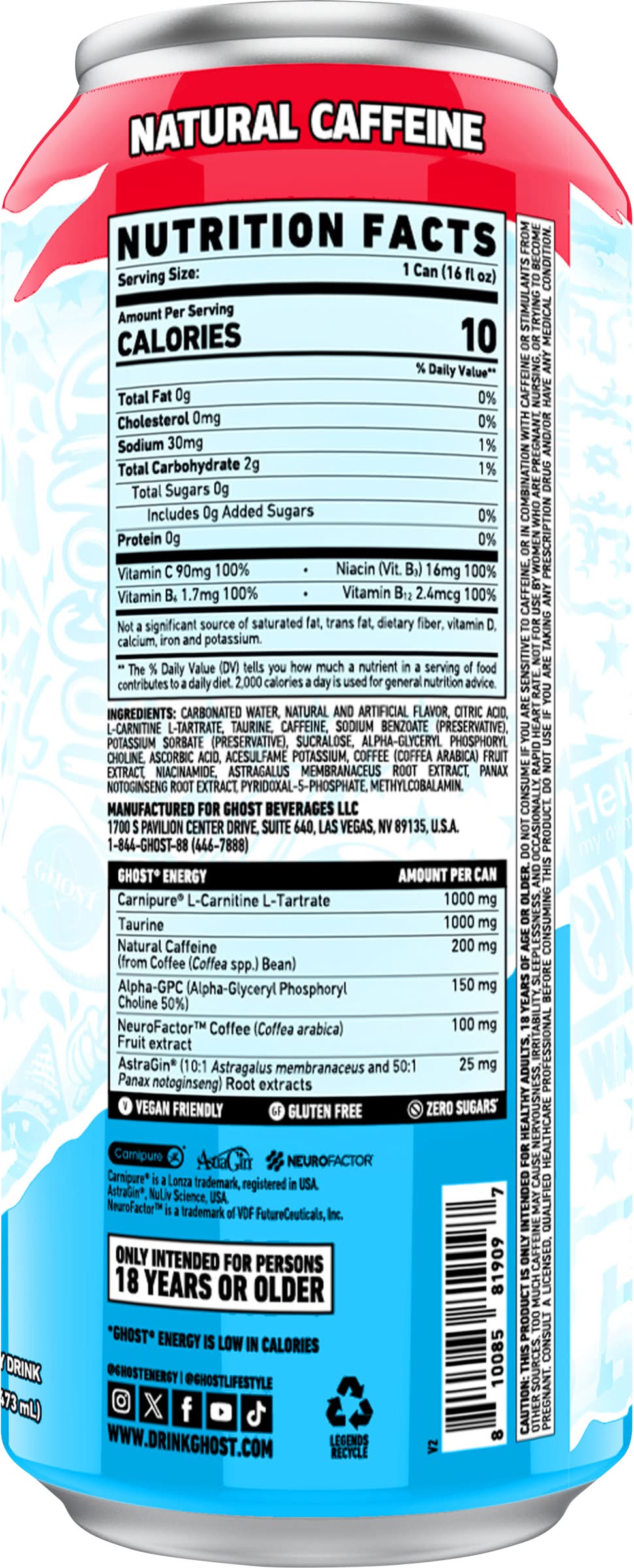 Ingredients: Ghost Energy: Carnipure L-Carnitine L-Tartrate, Taurine, Natural Caffeine (from Coffee (Coffea Spp, ) Bean), Alpha-Gpc (Alpha-Glyceryl Phosphoryl Choline 50%), Neurofactor Coffee (Coffea Arabica) Fruit Extract, Astragin (10:1 Astragalus Membranaceus and 50:1 Panax Notoginseng) Root Extracts. Carbonated Water, Natural and Artificial Flavor, Citric Acid, L-Carnitine L-Tartrate, Taurine, Caffeine, Sodium Benzoate (Preservative), Potassium Sorbate (Preservative), Sucralose, Alpha-Glyceryl Phosphoryl Choline, Ascorbic Acid, Acesulfame Potassium, Coffee (Coffea Arabica) Fruit Extract Niacinamide, Astragalus Membranaceus Root Extract, Panax Notoginseng Root Extract, Pyridoxal-5-Phosphate, Methylcobalamin