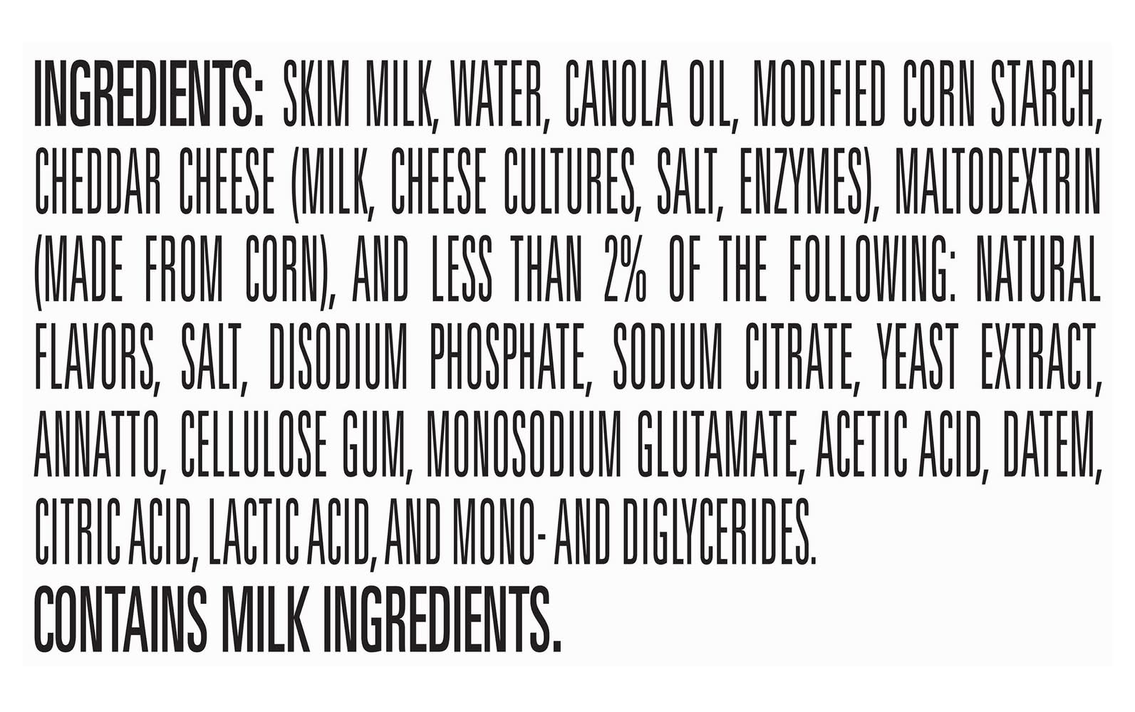 Ingredients: Skim Milk, Water, Canola Oil, Modified Corn Starch, Cheddar Cheese (Milk, Cheese Cultures, Salt, Enzymes), Maltodextrin (Made from Corn), and Less than 2% of the Following: Natural Flavors, Salt, Disodium Phosphate, Sodium Citrate, Yeast Extract, Annatto, Cellulose Gum, Monosodium Glutamate, Acetic Acid, DATEM, Citric Acid, Lactic Acid, and Mono- and Diglycerides Contains: Milk