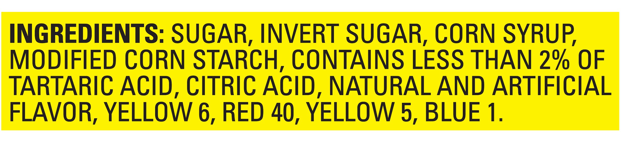 Ingredients: Sugar, Invert Sugar, Corn Syrup, Modified Corn Starch, Tartaric Acid, Citric Acid, Natural and Artificial Flavoring, Yellow 6, Red 40, Yellow 5, Blue 1.
