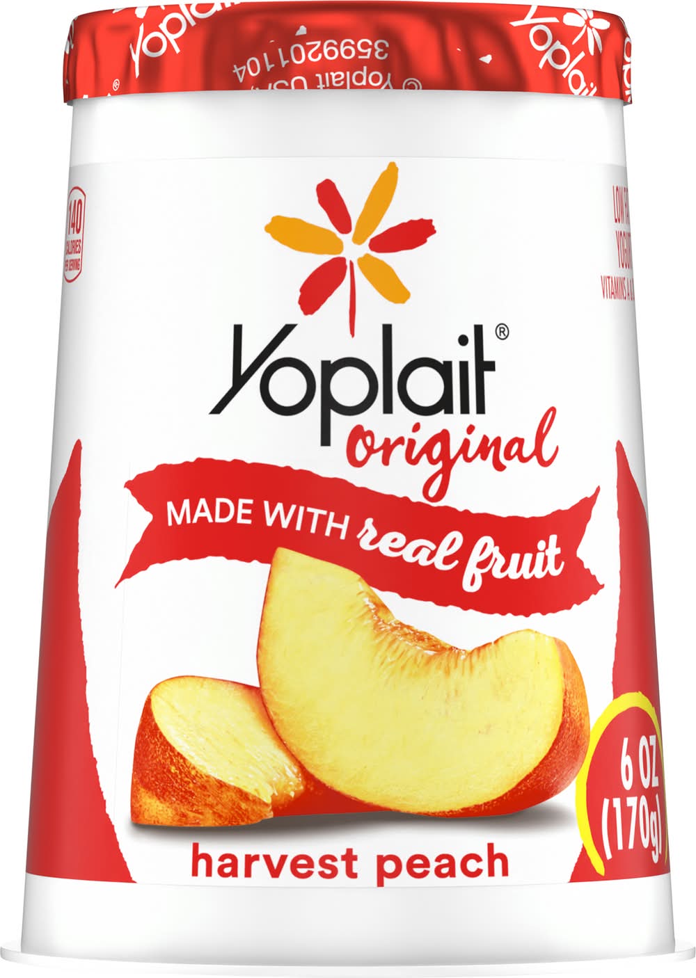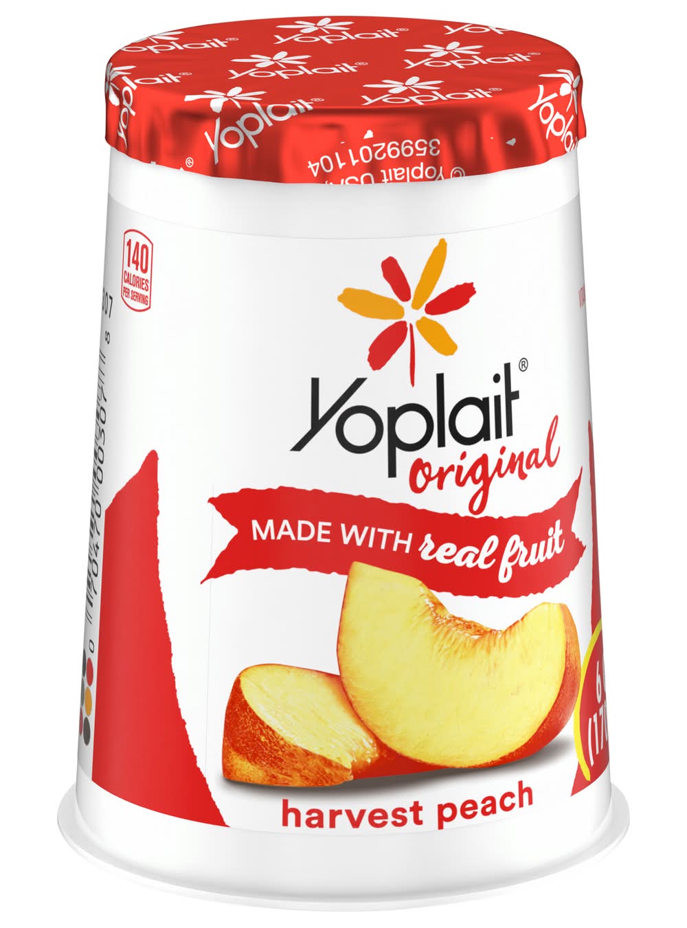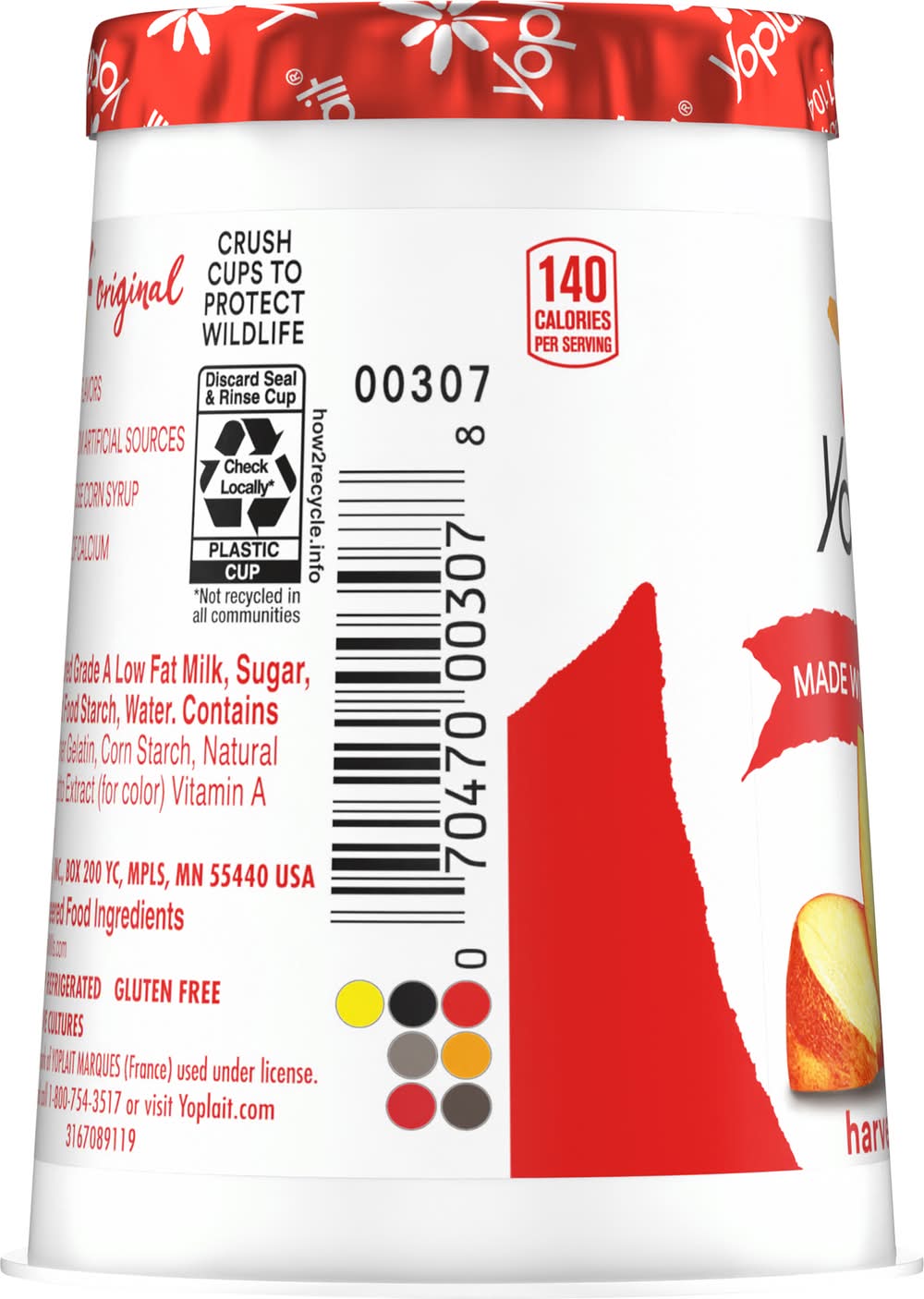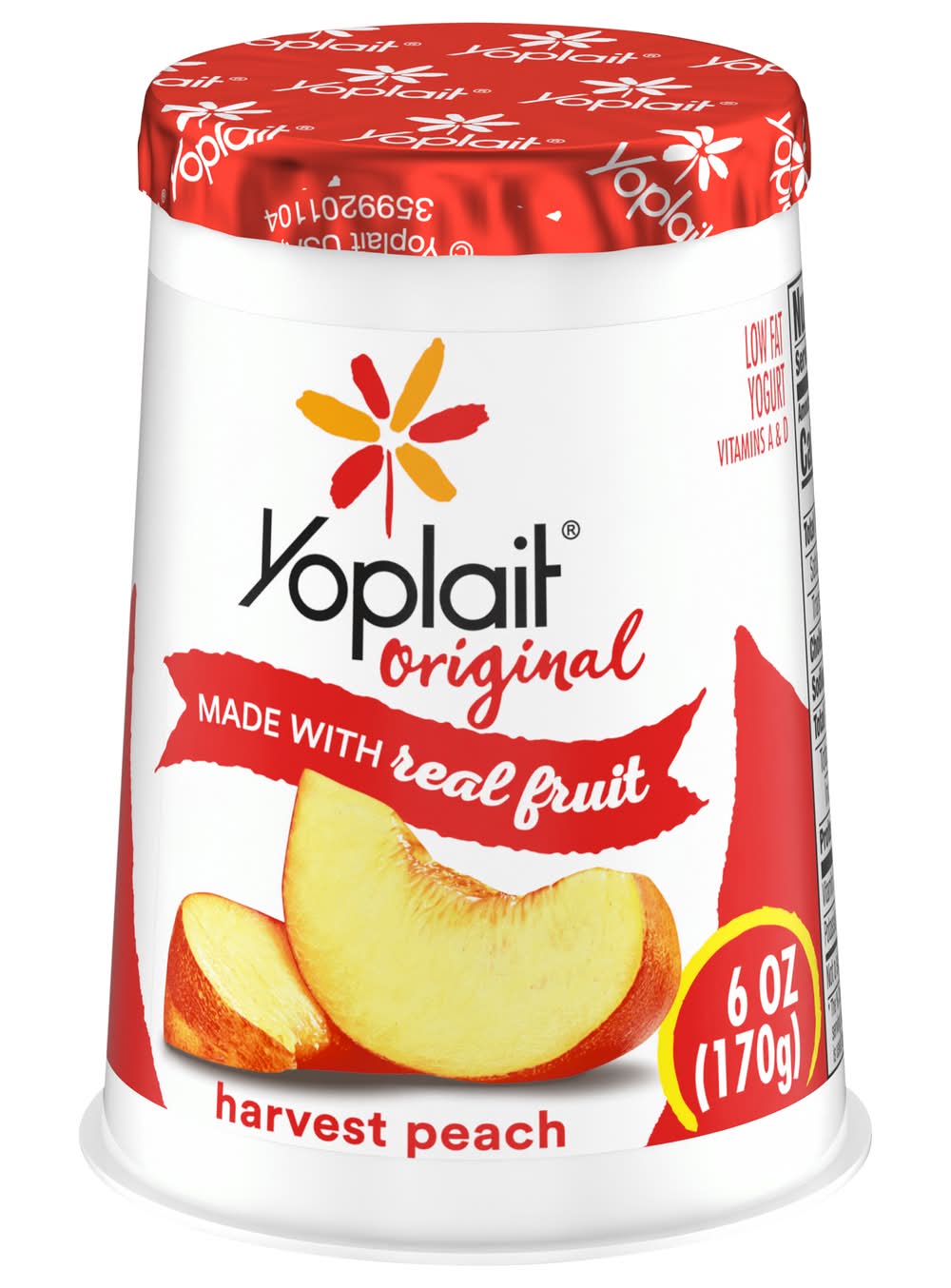 Smooth ande creamy yogurt packed with fresh harvest peaches • Brand: Yoplait • Flavor: Harvest peach • gluten-free, kosher, low fat • Yoplait USA, Inc., Box 200 YC,MPLS,MN,55440 • Packaging: Reusable