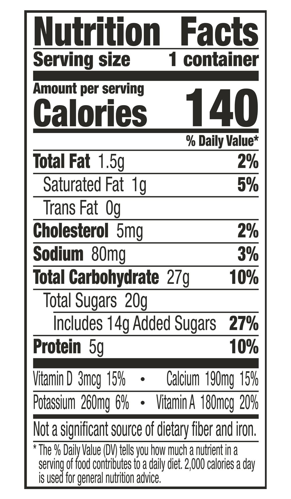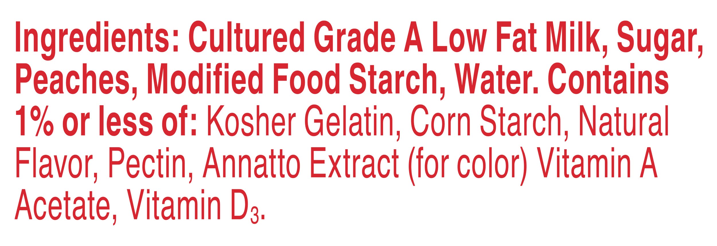 Ingredients: Cultured Grade A Low Fat Milk, Sugar, Peaches, Modified Food Starch, Water, Contains 1% or Less of: Kosher Gelatin, Corn Starch, Natural Flavor, Pectin, Annatto Extract (for Color) Vitamin A Acetate, Vitamin D3 Contains: Milk