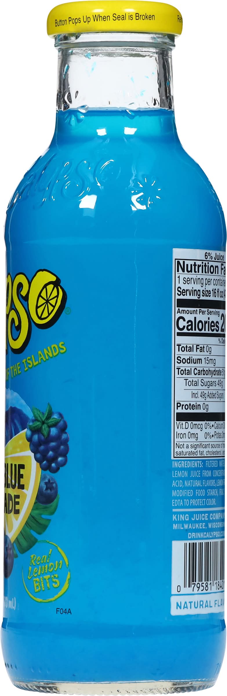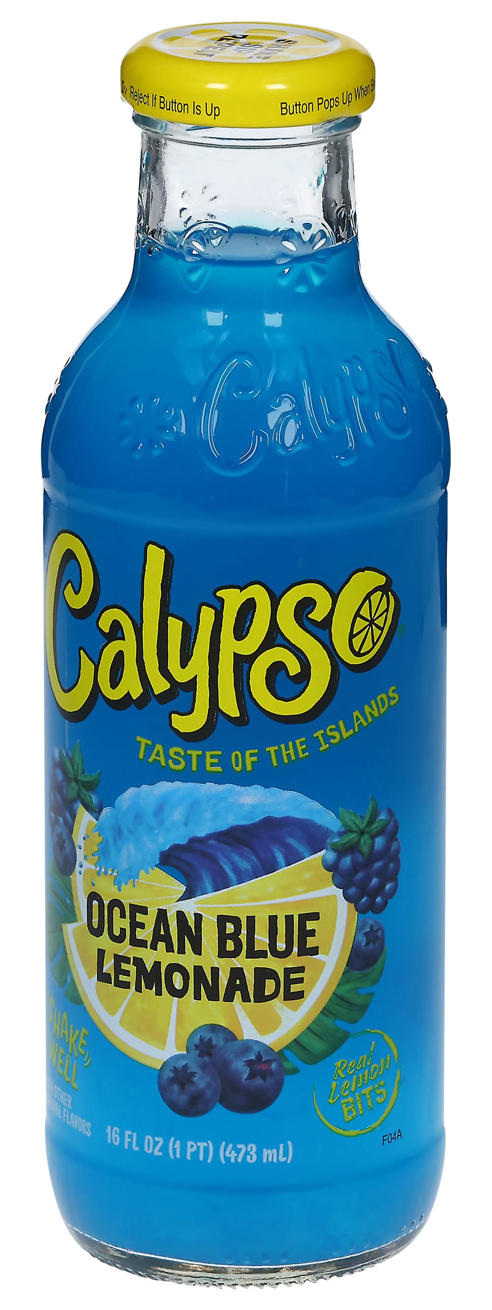 With other natural flavors. Natural flavors. Real lemon bits. Taste of the Islands: Some say if you hold a big seashell to your ear, you can hear the ocean waves crashing. I say, hold an Ocean Blue Lemonade to your mouth instead. It's a whole tidal wave of blue raspberry flavor that you can hear with your taste buds. • Brand: Calypso • kosher • King Juice Company, Inc., Milwaukee,WI,53221