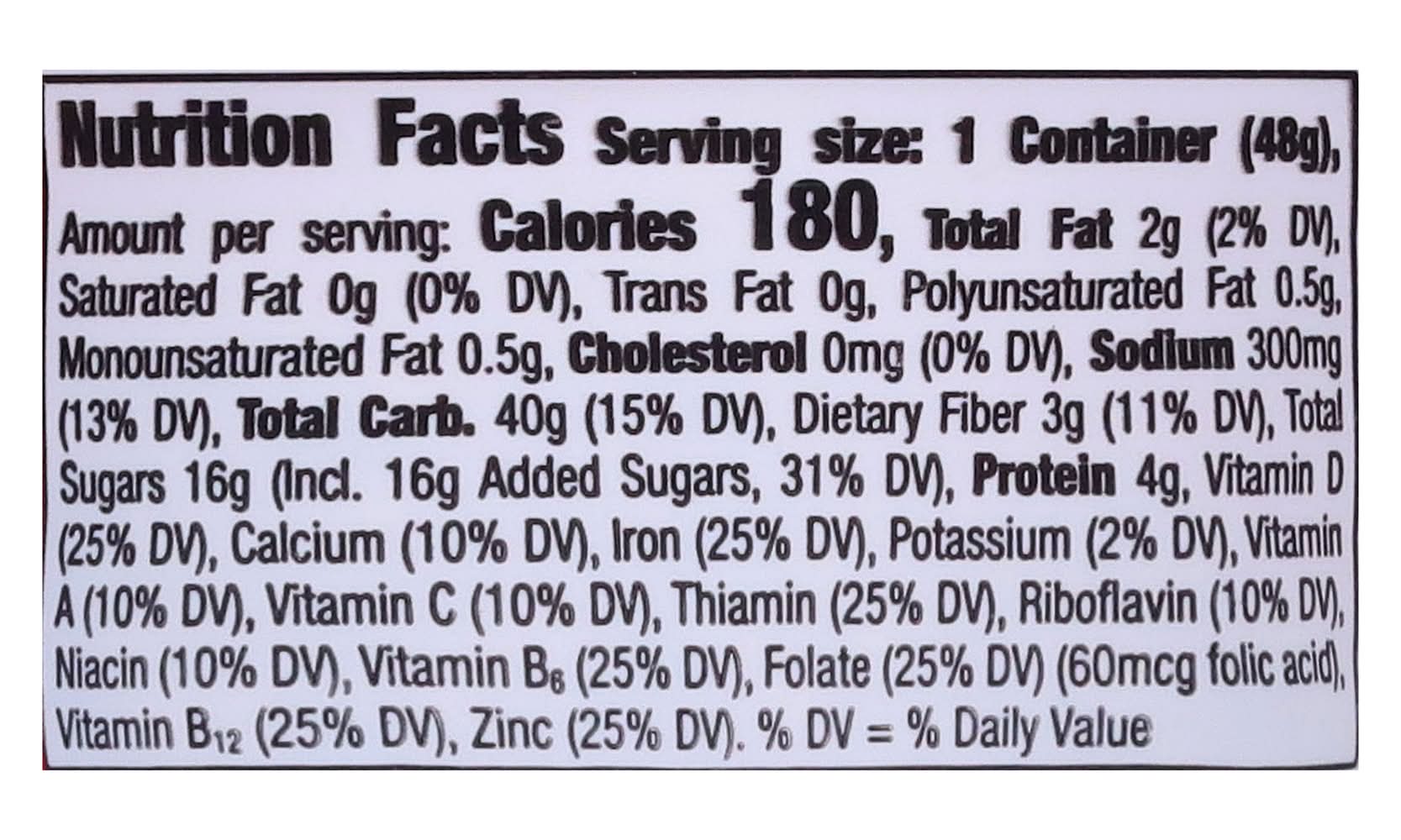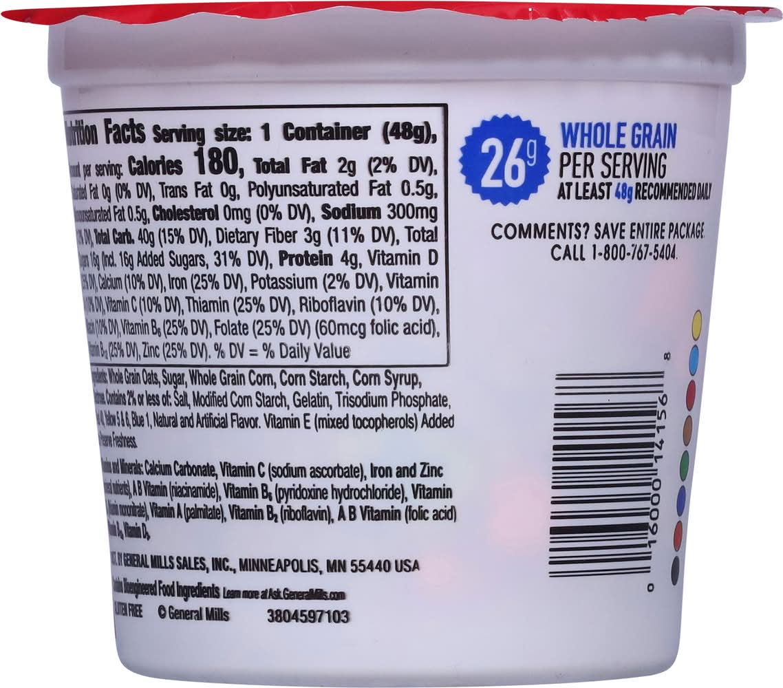 Ingredients: Whole Grain Oats, Sugar, Whole Grain Corn, Corn Starch, Corn Syrup, Dextrose, Contains 2% or Less of: Salt, Modified Corn Starch, Gelatin, Trisodium Phosphate, Red 40, Yellow 5 & 6, Blue 1, Natural and Artificial Flavor, Vitamin E (Mixed Tocopherols) Added to Preserve Freshness, Vitamins and Minerals: Calcium Carbonate, Vitamin C (Sodium Ascorbate), Iron and Zinc (Mineral Nutrients), a B Vitamin (Niacinamide), Vitamin B6, (Pyridoxine Hydrochloride), Vitamin B1, (Thiamin Mononitrate), Vitamin A (Palmitate), Vitamin B2 (Riboflavin), a B Vitamin (Folic Acid) Vitamin B12, Vitamin D3