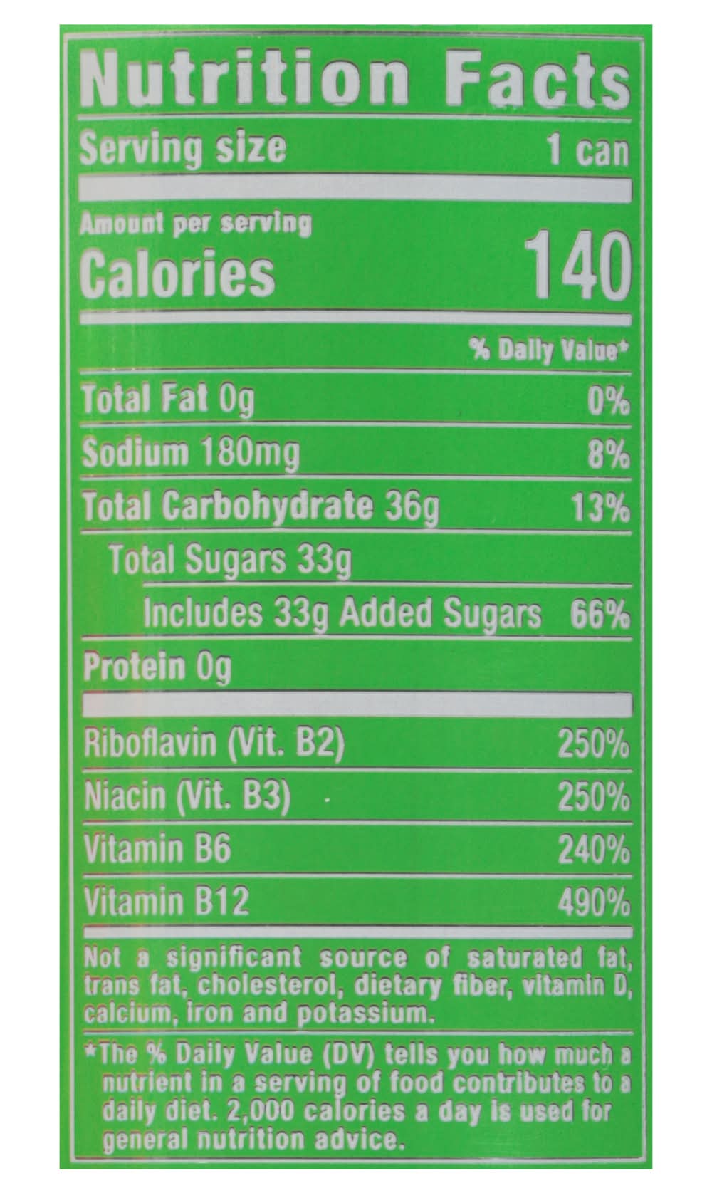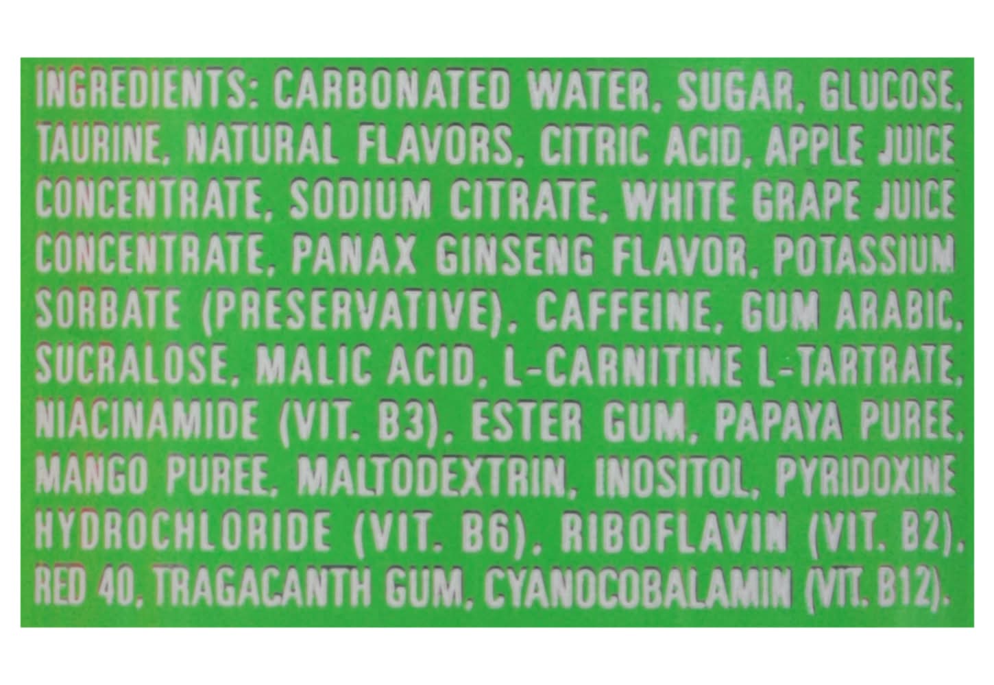 Ingredients: Carbonated Water, Sugar, Glucose, Taurine, Natural Flavors, Citric Acid, Apple Juice Concentrate, Sodium Citrate, White Grape Juice Concentrate, Panax Ginseng Flavor, Potassium Sorbate (Preservative), Caffeine, Gum Arabic, Sucralose, Malic Acid, L-Carnitine L-Tartrate, Niacinamide (Vit. B3), Ester Gum, Papaya Puree, Mango Puree, Maltodextrin, Inositol, Pyridoxine Hydrochloride (Vit. B6), Riboflavin (Vit. B2), Red 40, Tragacanth Gum, Cyanocobalamin (Vit. B12)