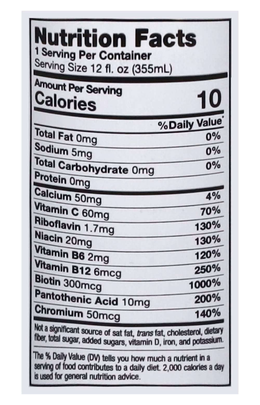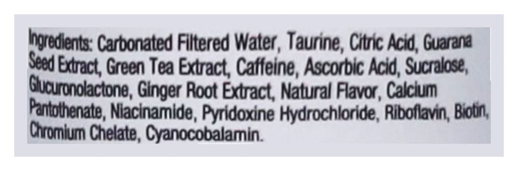 Ingredients: Carbonated Filtered Water, Taurine, Citric Acid, Guarana Seed Extract, Green Tea Extract, Caffeine, Ascorbic Acid, Sucralose, Glucuronolactone, Ginger Root Extract, Natural Flavor, Calcium Pantothenate, Niacinamide, Pyridoxine Hydrochloride, Riboflavin, Biotin, Chromium Chelate, Cyanocobalamin