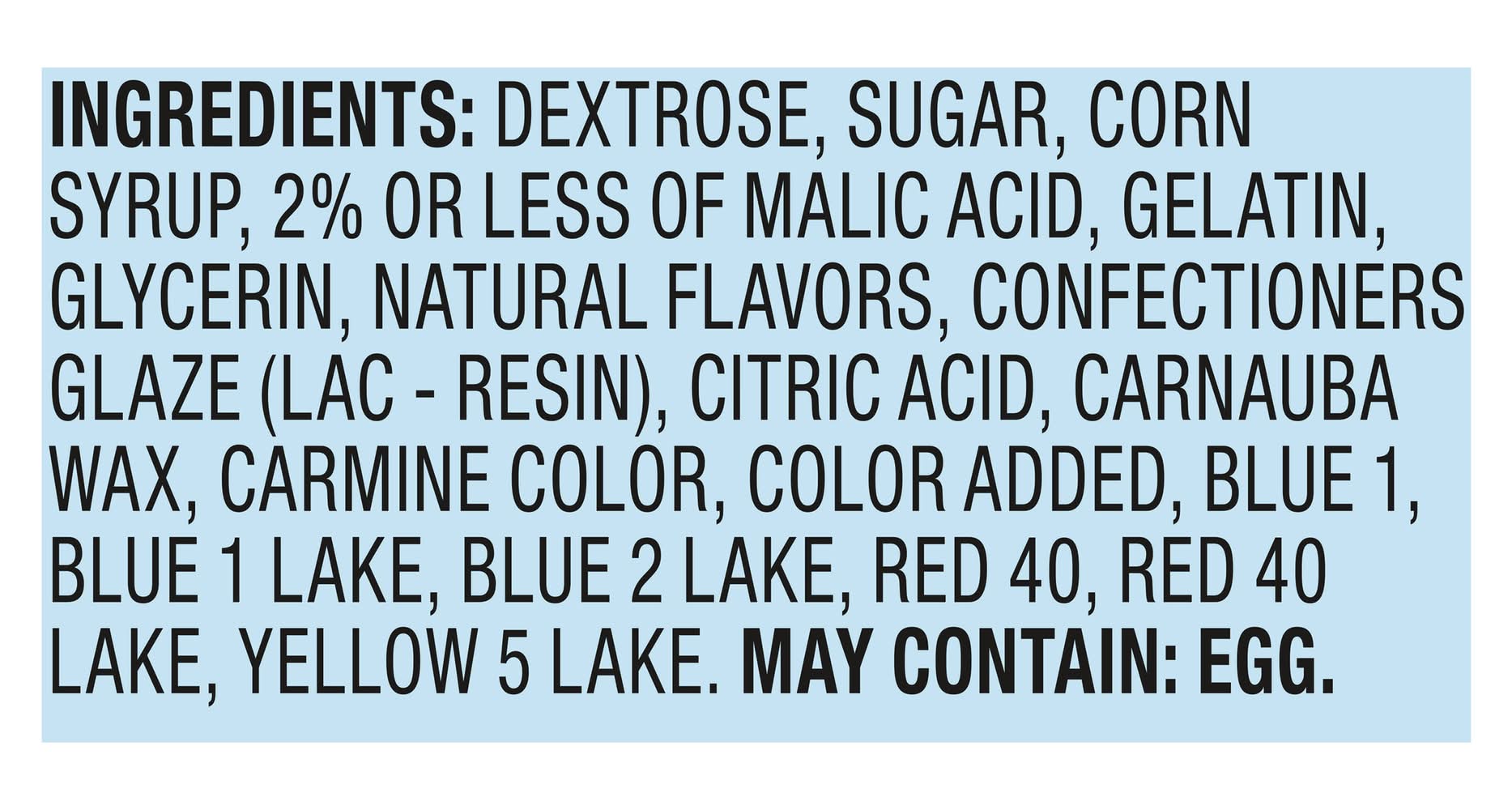 Ingredients: DEXTROSE, SUGAR, CORN SYRUP, 2% OR LESS OF MALIC ACID, GELATIN, GLYCERIN, NATURAL FLAVORS, CONFECTIONER'S GLAZE (LACRESIN), CITRIC ACID, CARNAUBA WAX, CARMINE COLOR, COLOR ADDED, BLUE 1, BLUE 1 LAKE, BLUE 2 LAKE, RED 40, RED 40 LAKE, YELLOW 5 LAKE. Contains: Corn, Eggs