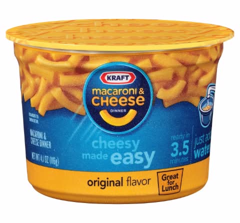 Help yourself to a Big Cup of comfort. Kraft Easy Mac Original Flavor Mac & Cheese Big Cup is easy and ready in just minutes. Kids and adults love the rich taste and creamy texture of macaroni pasta with cheesy goodness. Almost twice the size of our regular cups, our easy macaroni and cheese big cups include macaroni pasta and original flavor cheese sauce mix so you have everything you need to make a delicious quick dinner, just add water. With no artificial flavors, preservatives or dyes, our microwavable macaroni and cheese cup makes a perfect snack or a classic meal side. Preparing our 4.1 ounce microwave dinner is a breeze, just combine the pasta with water to measuring line in cup, microwave for 3.5 minutes and stir in the cheese sauce mix. Kraft Mac & Cheese inspires the positive power of comfort. • Brand: Kraft • Flavor: • Kraft Foods, Chicago, IL, 60601