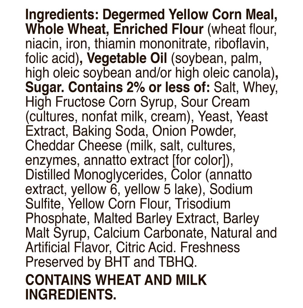 Ingredients: Degermed Yellow Corn Meal, Whole Wheat, Enriched Flour (Wheat Flour, Niacin, Iron, Thiamin Mononitrate, Riboflavin, Folic Acid), Vegetable Oil (Soybean, Palm, High Oleic Soybean and/or High Oleic Canola), Sugar, Contains 2% or Less of: Salt, Whey, High Fructose Corn Syrup, Sour Cream (Cultures, Nonfat Milk, Cream), Yeast, Yeast Extract, Baking Soda, Onion Powder, Cheddar Cheese (Milk, Salt, Cultures, Enzymes, Annatto Extract [for Color]), Distilled Monoglycerides, Color (Annatto Extract, Yellow 6, Yellow 5 Lake), Sodium Sulfite, Yellow Corn Flour, Trisodium Phosphate, Malted Barley Extract, Barley Malt Syrup, Calcium Carbonate, Natural and Artificial Flavor, Citric Acid, Freshness Preserved by BHT and TBHQ Contains: Wheat, Soybeans, Milk, Barley, Sulfites