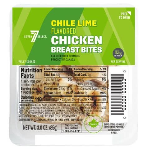 Chile Lime Chicken Bites have mellow chile flavor with a well-balanced lime. Grilled chicken breast bites are chilled and diced into large chunks for a perfect high-protein, no carb snack! Brand: 7-eleven