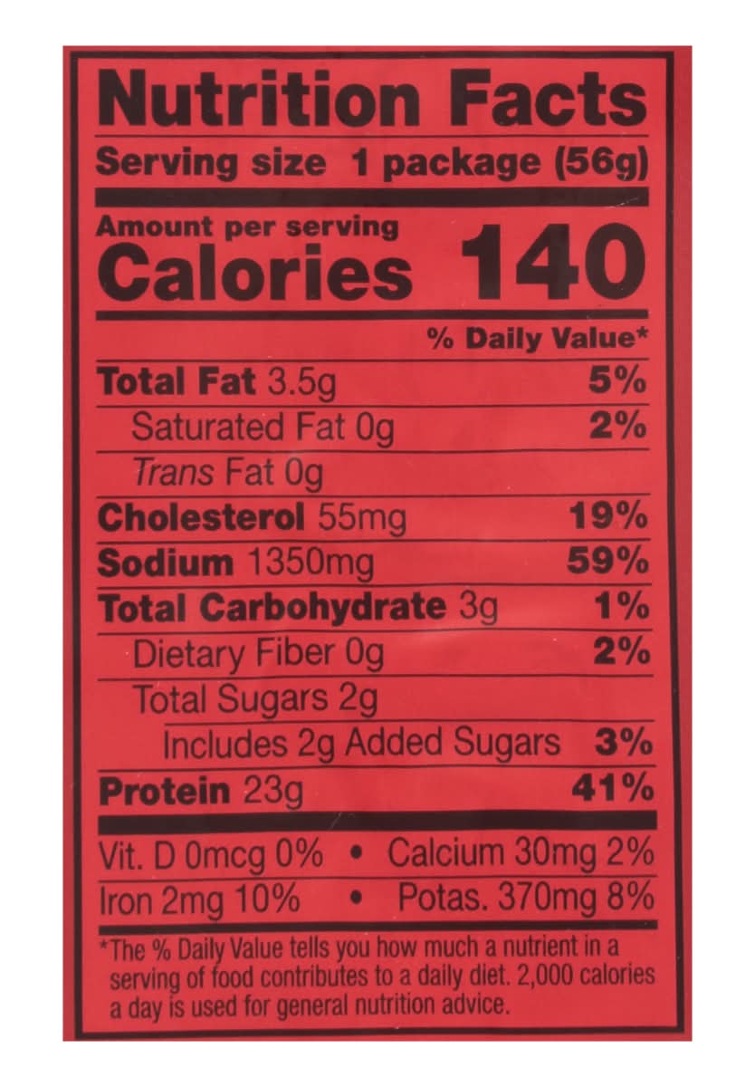 Ingredients: Beef, Water, Salt, Contains 2% or Less of Brown Sugar, Black Pepper, Flavors, Spices, Monosodium Glutamate, Sugar, Sodium Nitrite