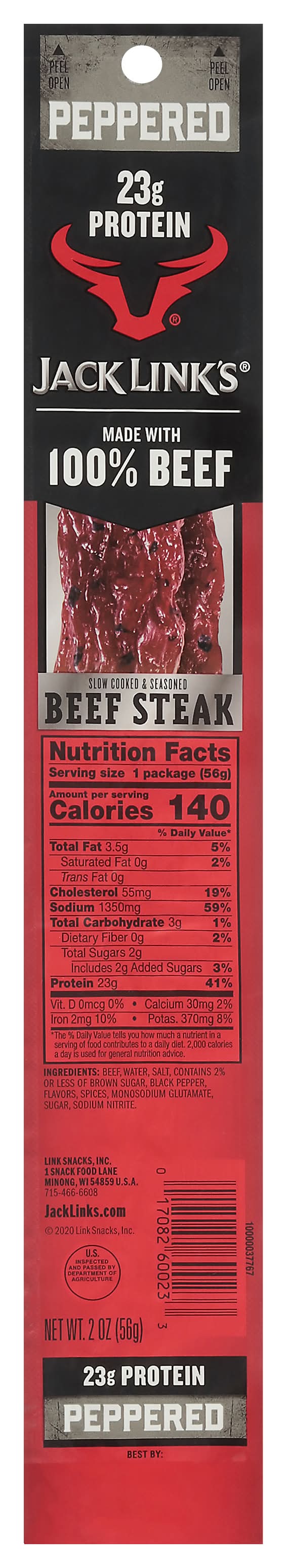 Black pepper, an American favorite. Jack Link’s Peppered Beef Steaks pack just enough punch to satisfy your cravings without skimping on protein. Set the chalky protein bars aside and keep yourself fueled with a deliciously tender and savory peppered beef steak. Our bold spice blend makes this meat snack worth craving – plus, it’s Sasquatch approved. Whether you're frolicking in the woods, playing a round of golf, or doing routine house chores, there’s always time for snacks. Choose one that’ll sprinkle a little more feral into your routine. Peppered beef steaks, a great on-the-go snack solution that’s ready when you are. • Brand: Jack link's • Number of servings: 1