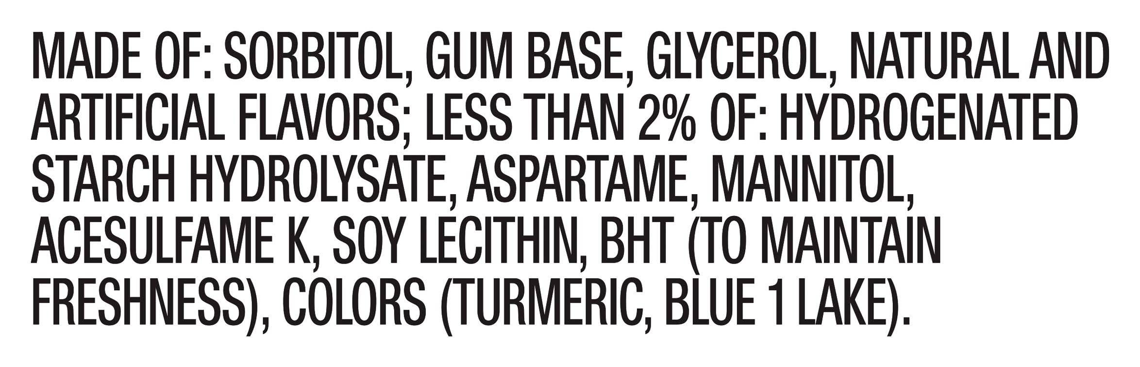 Ingredients: Sorbitol, Gum Base, Glycerol, Natural and Artificial Flavors, Less than 2% of: Hydrogenated Starch Hydrolysate, Aspartame, Mannitol, Acesulfame K, Soy Lecithin, BHT (to Maintain Freshness), Colors (Turmeric, Blue 1 Lake) Contains: Soybeans, Phenylalanine.